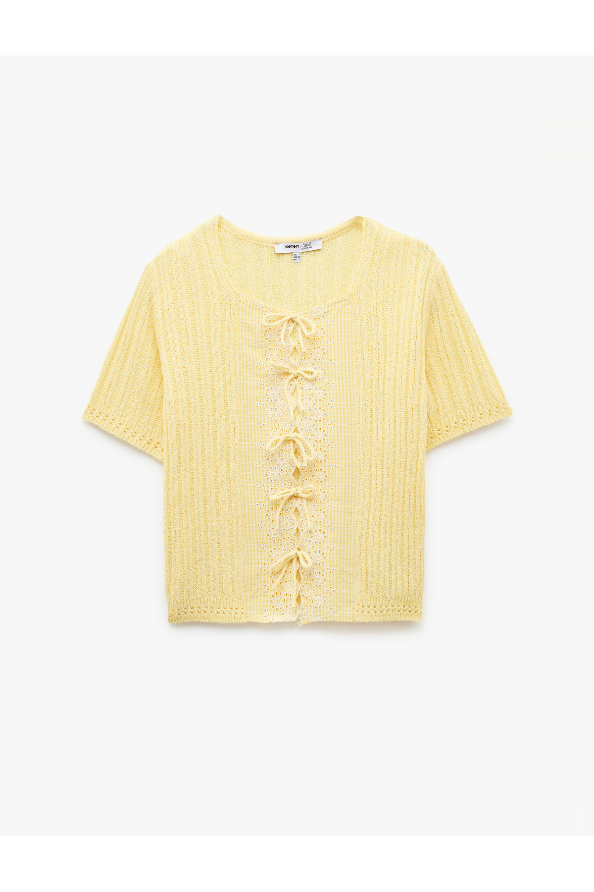 ژاکت بافتنی آستین کوتاه، یقه گرد، بندی با تزئینات پاپیونی.