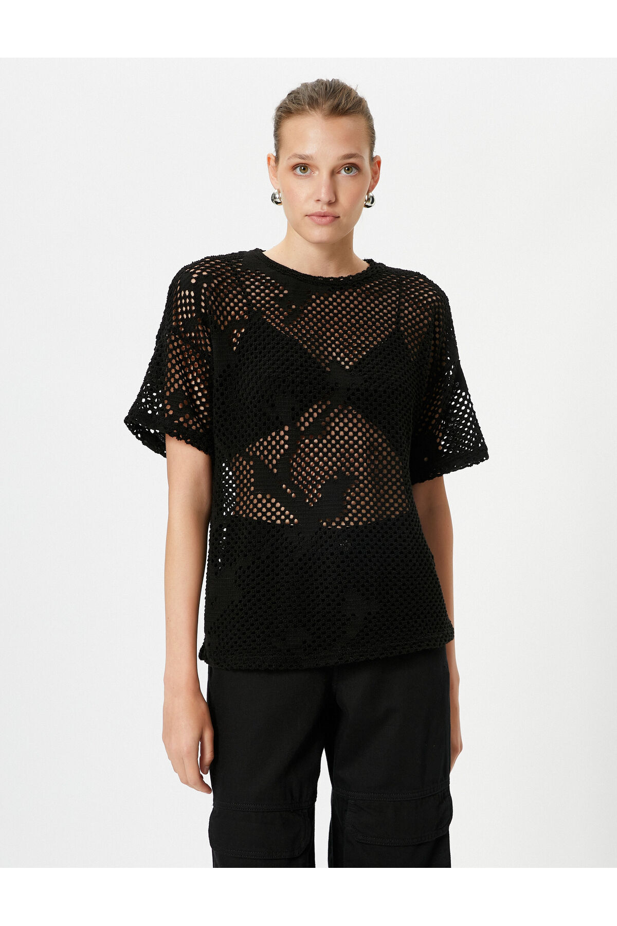 پلیور آستین کوتاه توری با یقه گرد و طرح باز