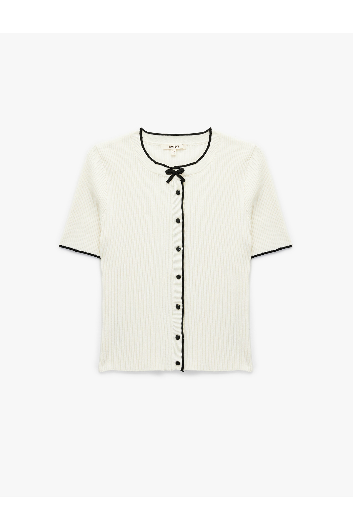 ژاکت بافتنی دکمهدار، آستین کوتاه، یقه گرد، با تزئینات پاپیونی.