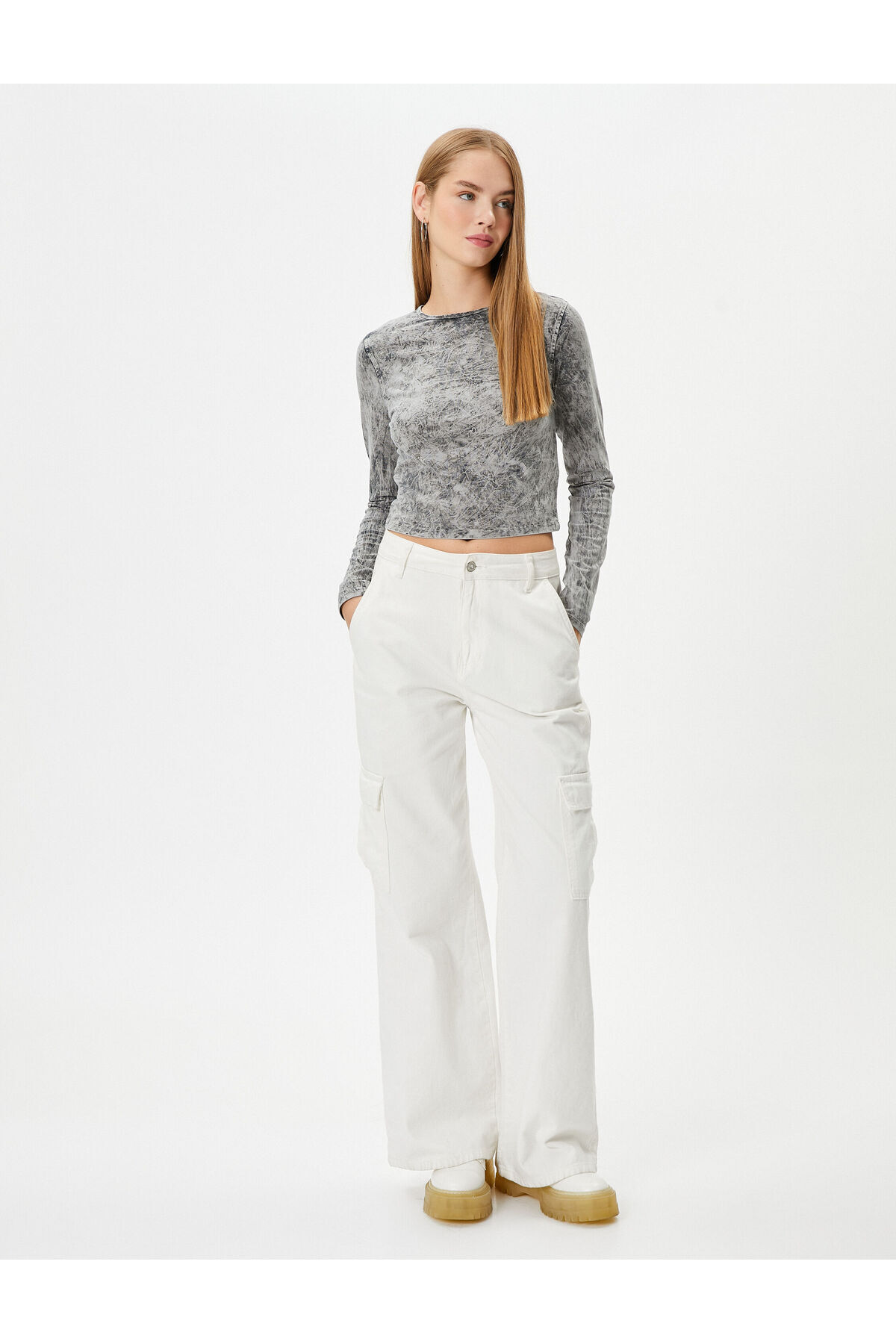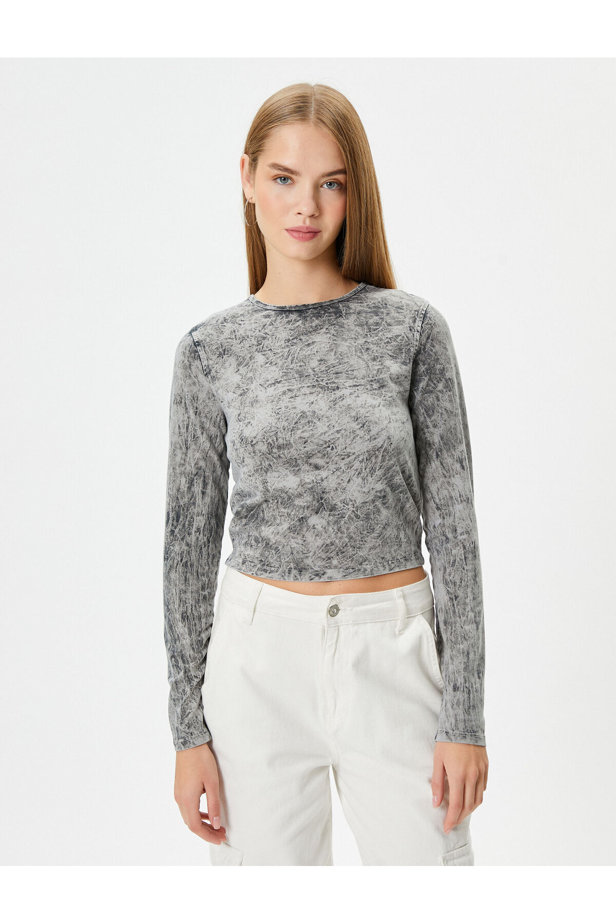 تیشرت آستین بلند، طرح محو، فیت باریک، یقه گرد، نخی.