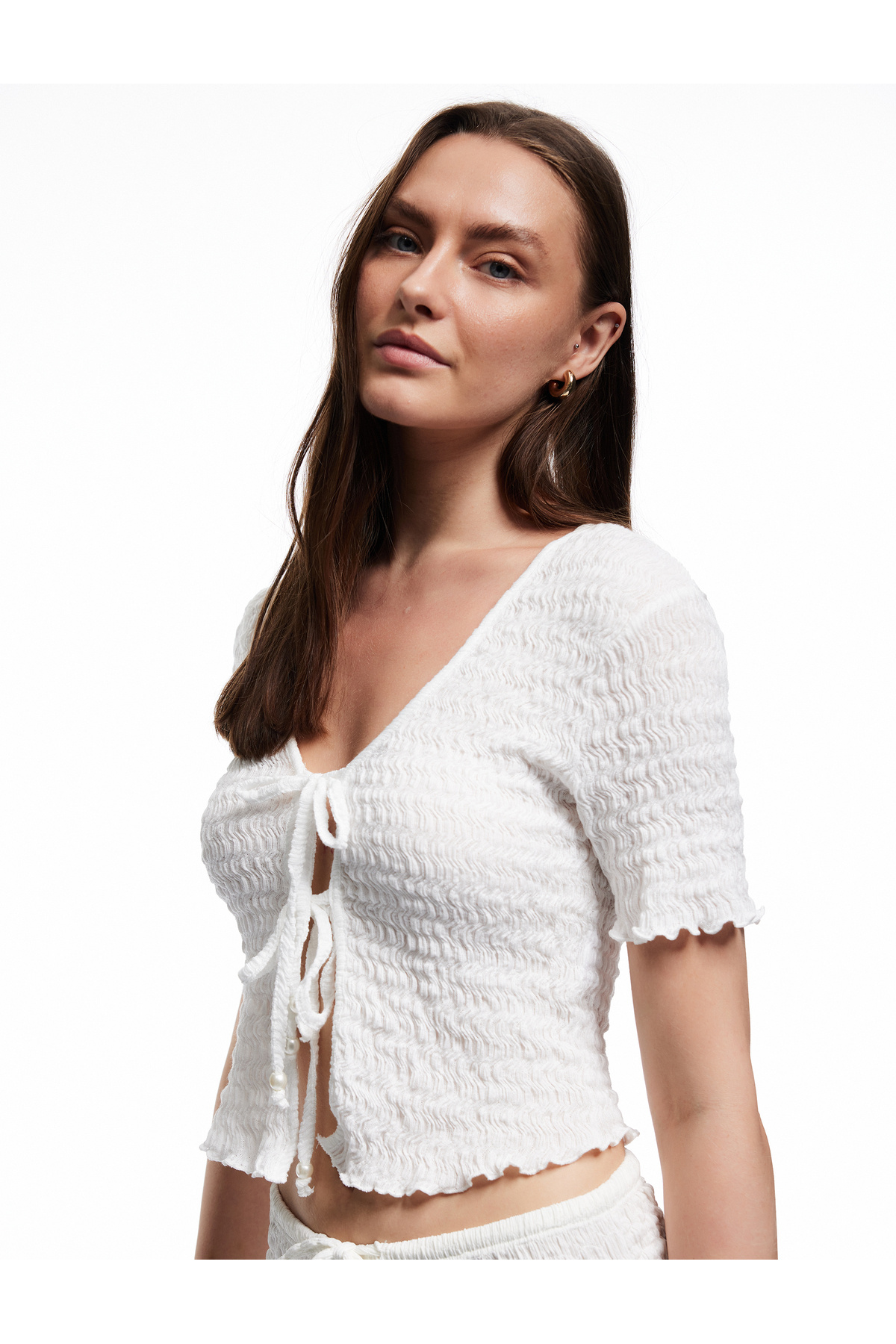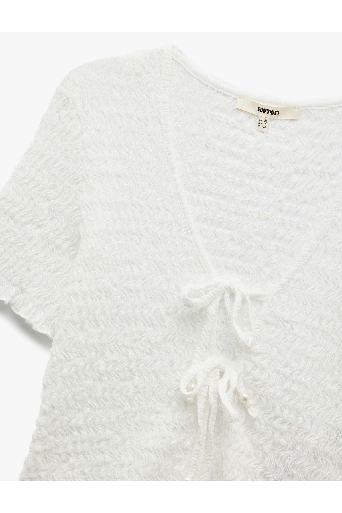 تیشرت آستین کوتاه یقه هفت با طرح پاپیون از جلو و بافتدار