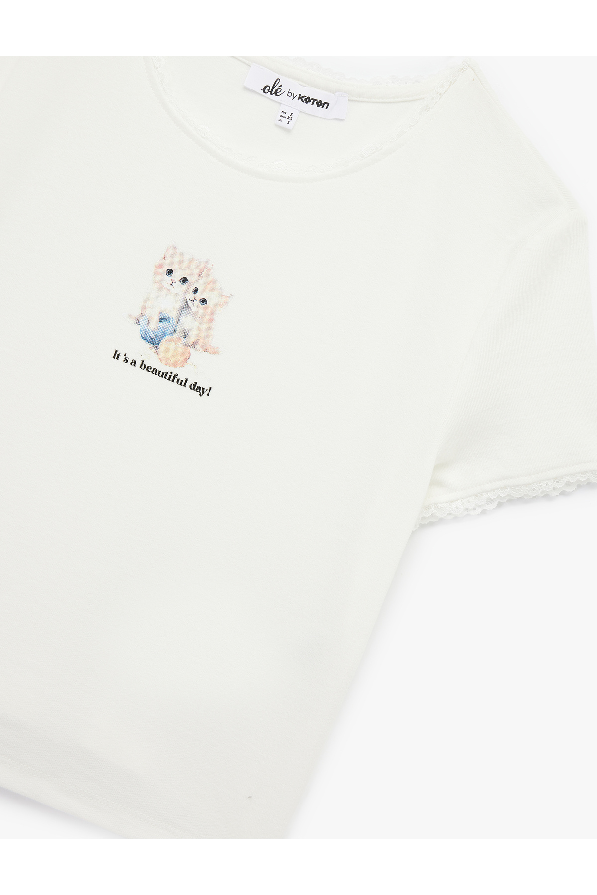 تیشرت نخی یقه گرد آستین کوتاه با طرح گربه.