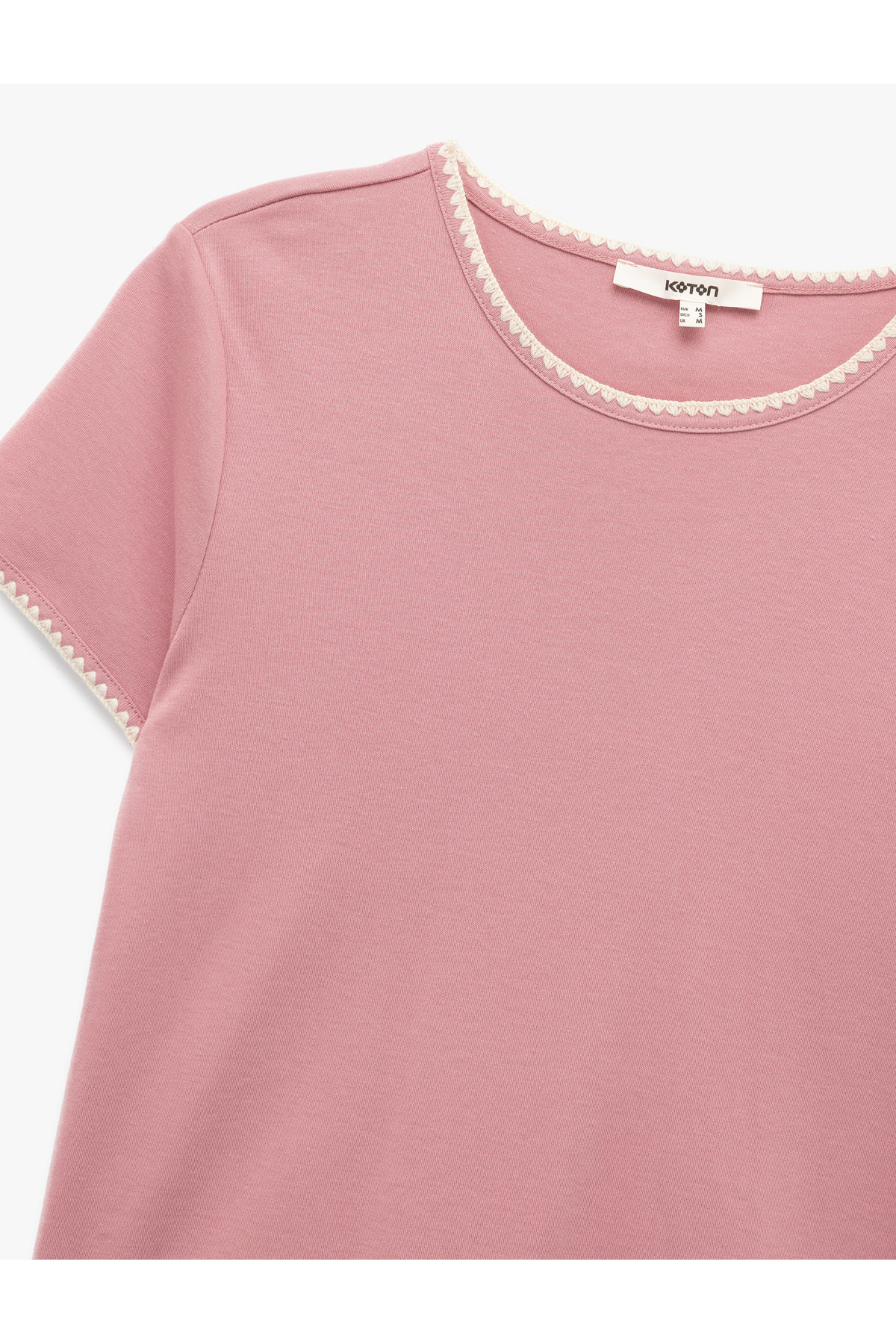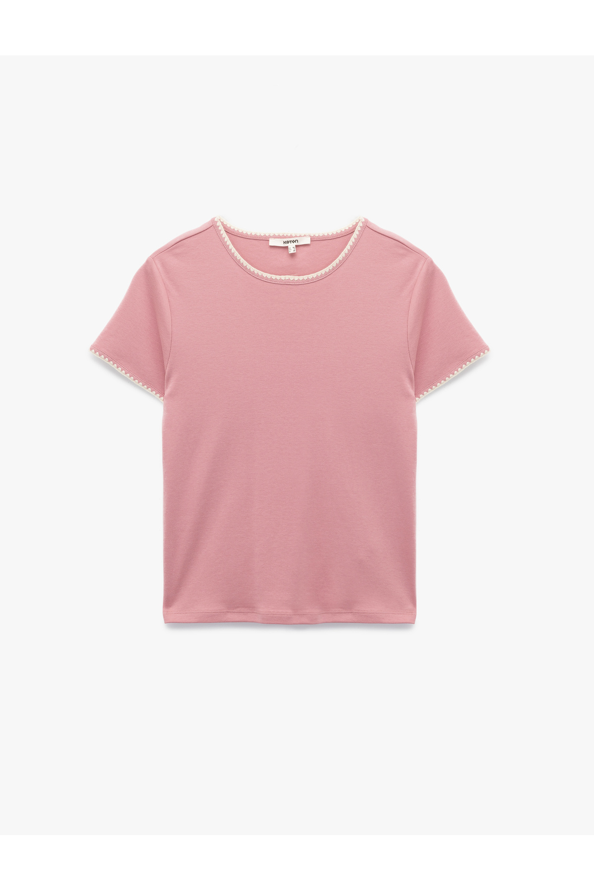 تی‌شرت یقه گرد آستین کوتاه نخی اسلیم فیت با جزئیات قلاب‌بافی شده