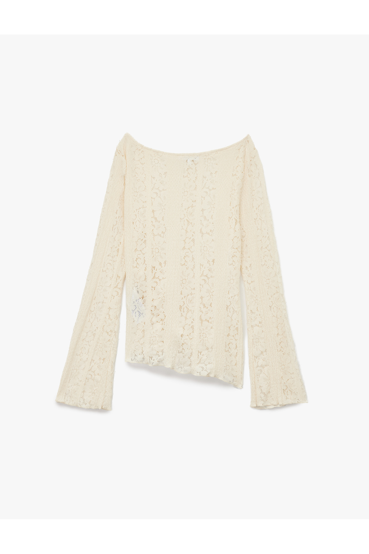 تیشرت آستین بلند یقه قایقی نامتقارن، طرح توری و اسلیم فیت