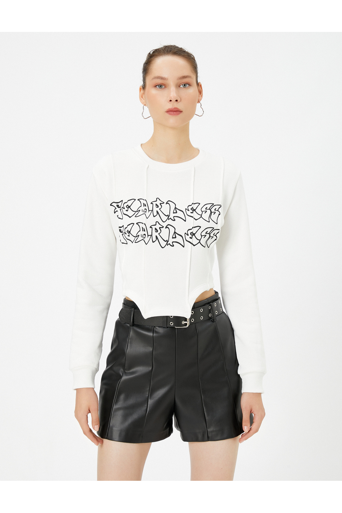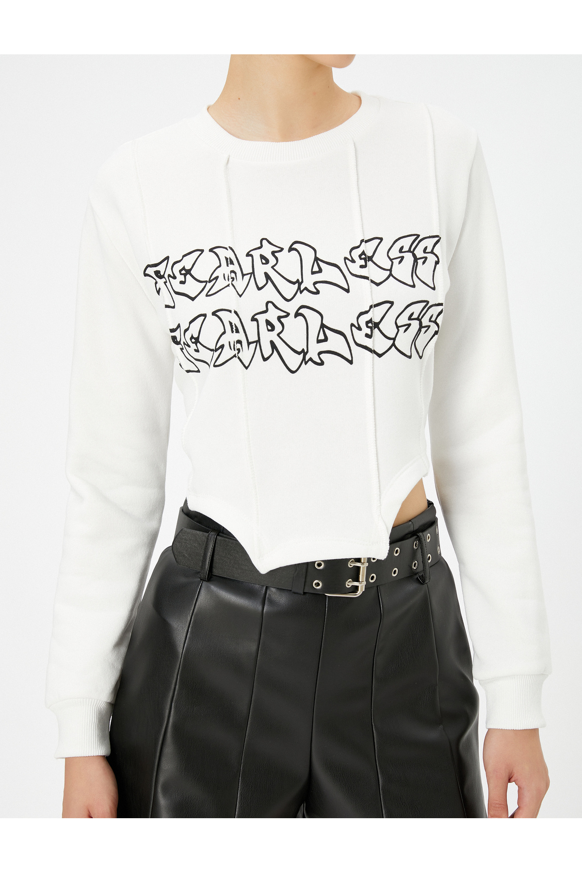 سویشرت برش نامتقارن کراپ با جزئیات کرست برس خورده و طرح چاپی