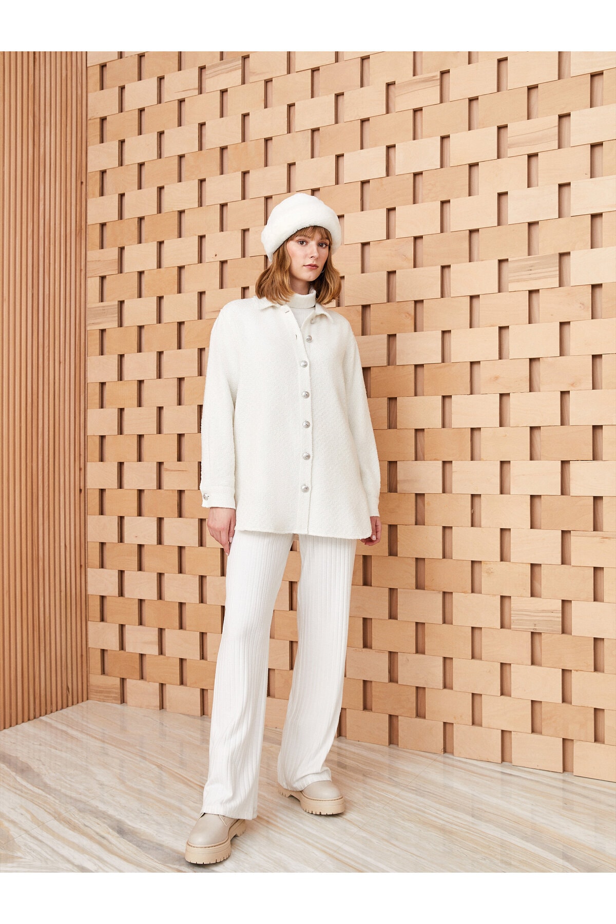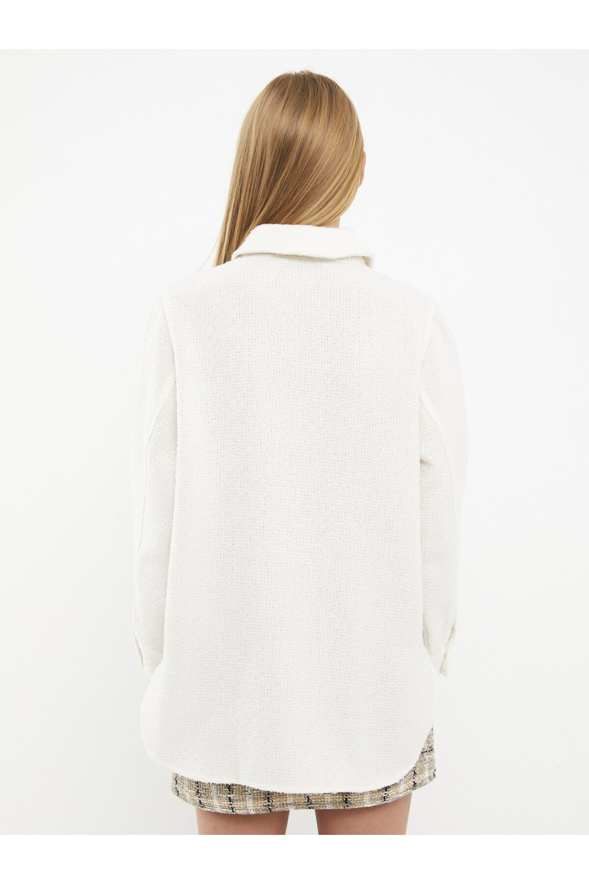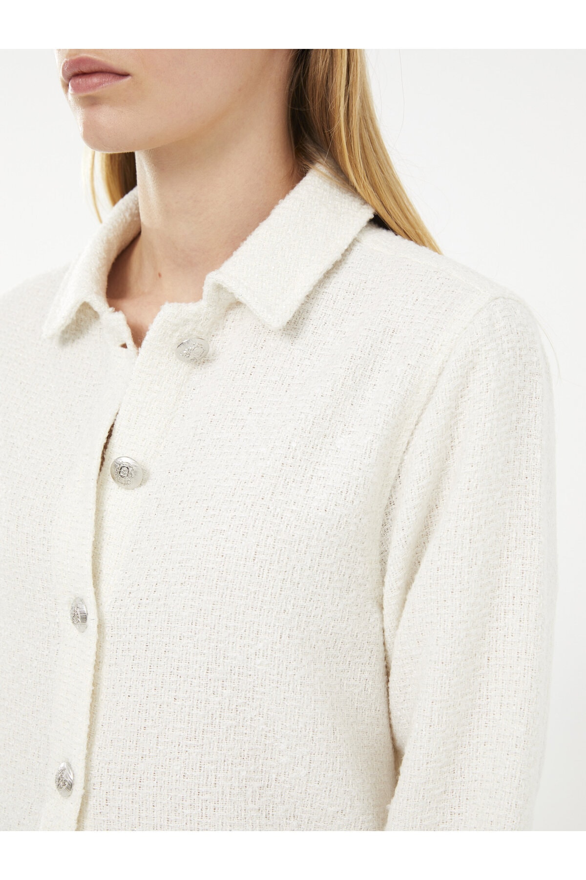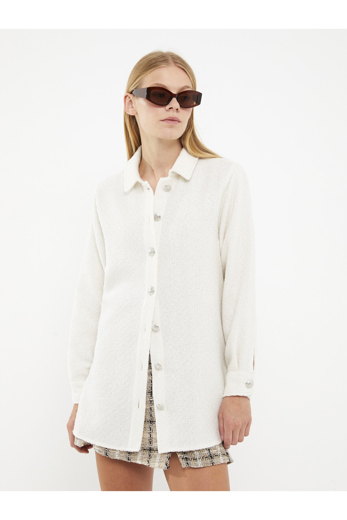 ژاکت پیراهن زنانه آستین بلند ساده طرح تویید، دکمهدار از جلو بسته میشود