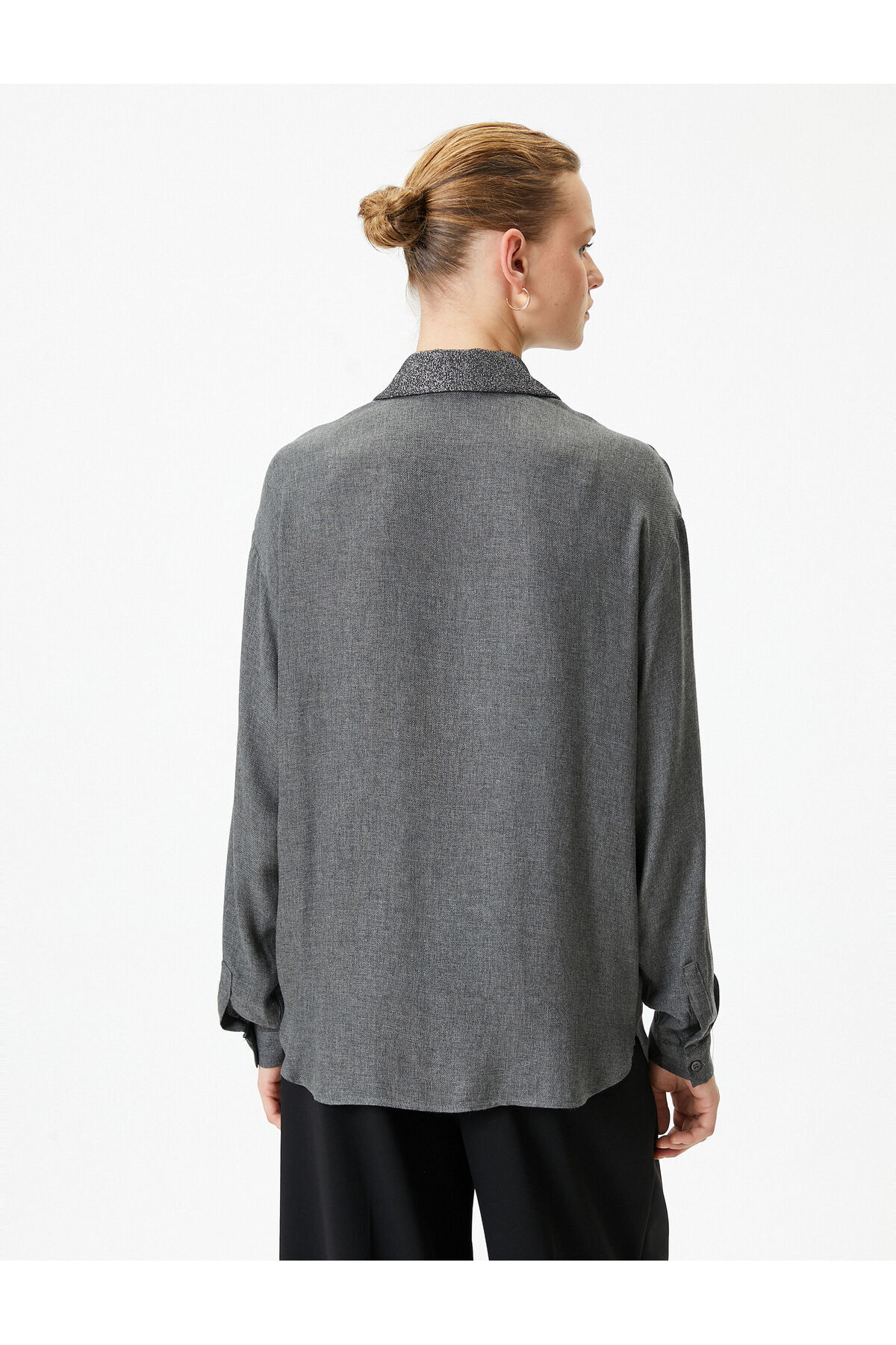 پیراهن آستین بلند با یقه‌ی طرح‌دار، دکمه‌دار، فرم معمولی.