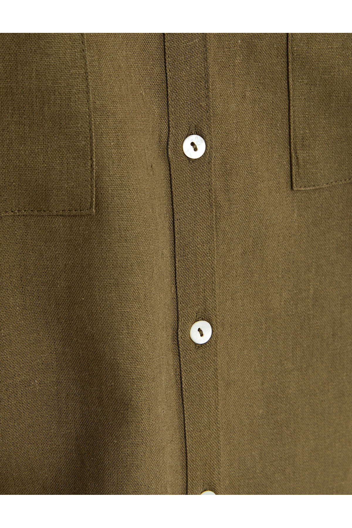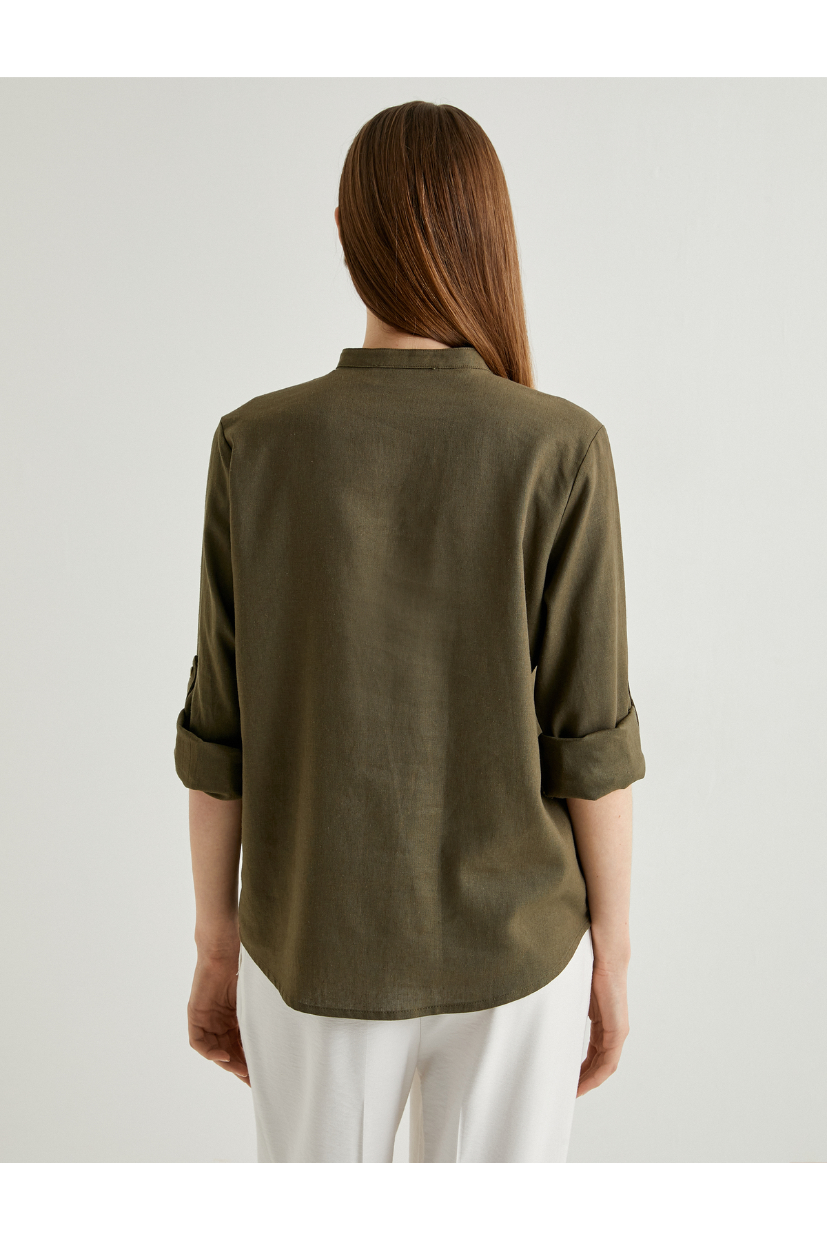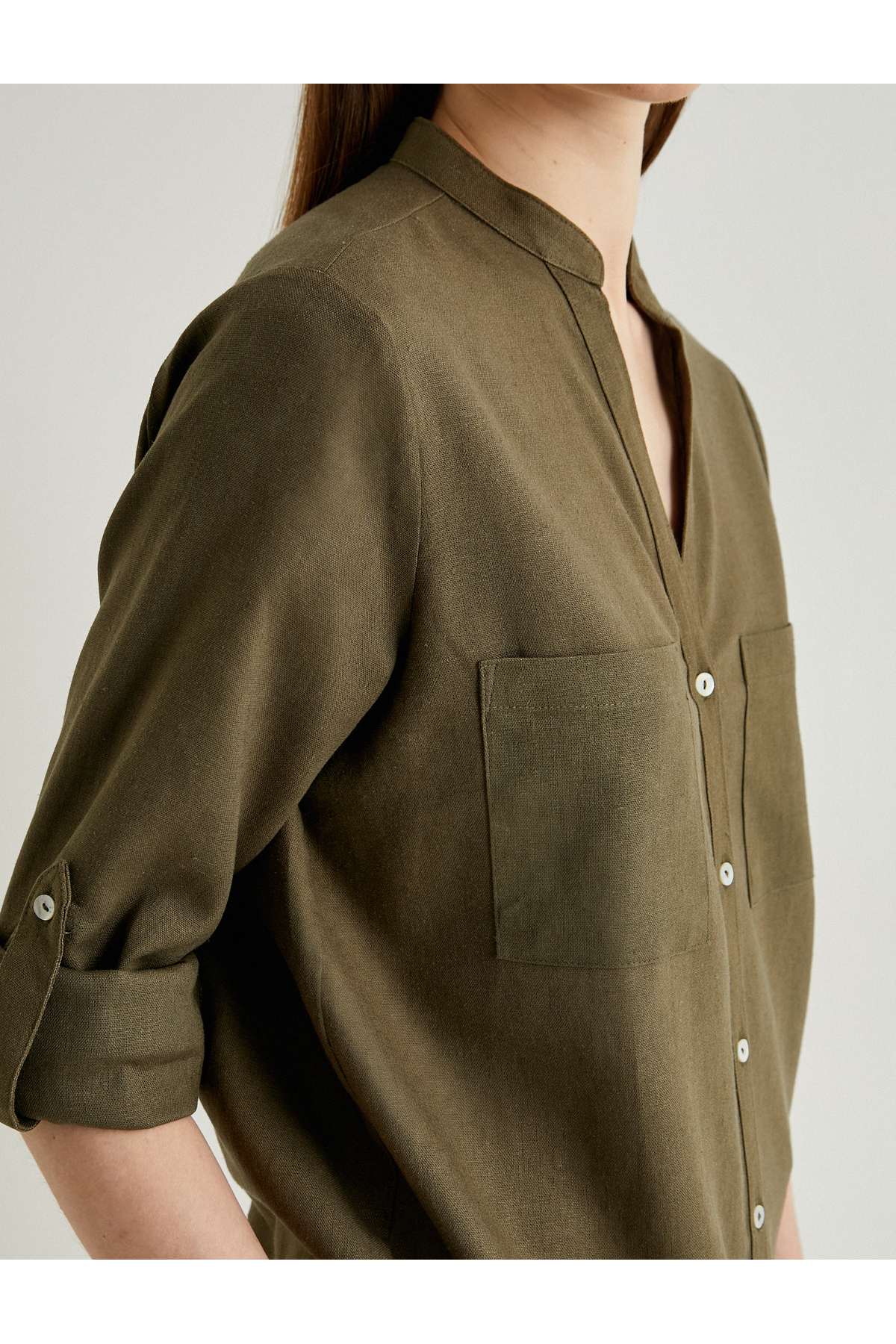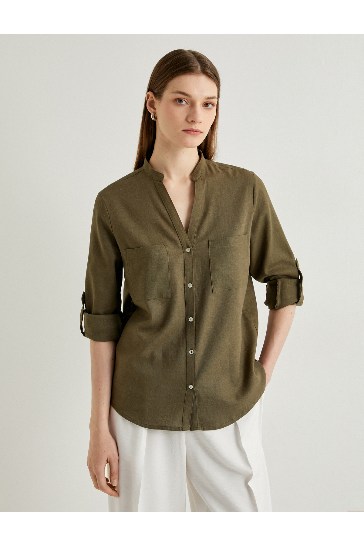 پیراهن یقه ماندارین، آستین بلند، دکمهدار، مخلوط کتان ویسکوز، برش استاندارد