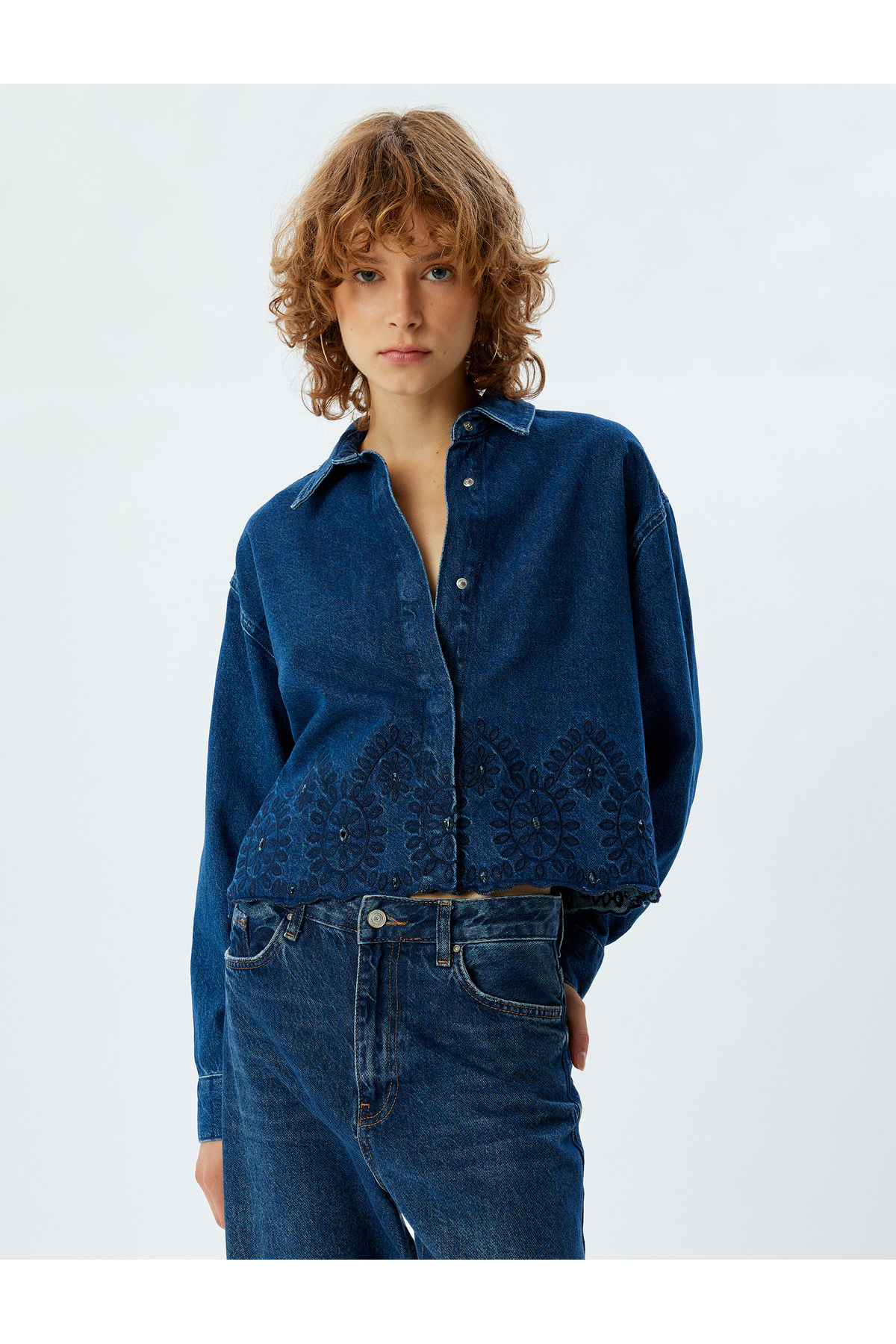 ژاکت پیراهن جین، یقه کلاسیک، دکمهدار، گلدوزی شده