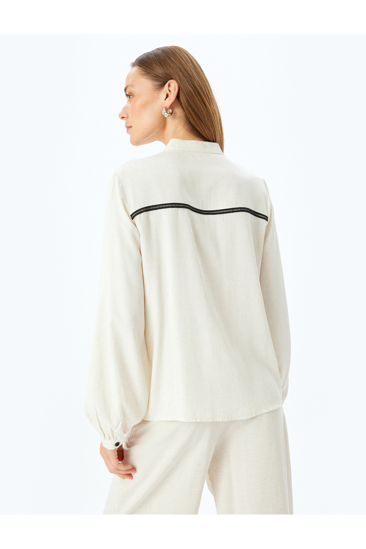 پیراهن آستین بلند یقه ماندارین با جزئیات راه راه، جنس ترکیبی از ویسکوز و کتان.
