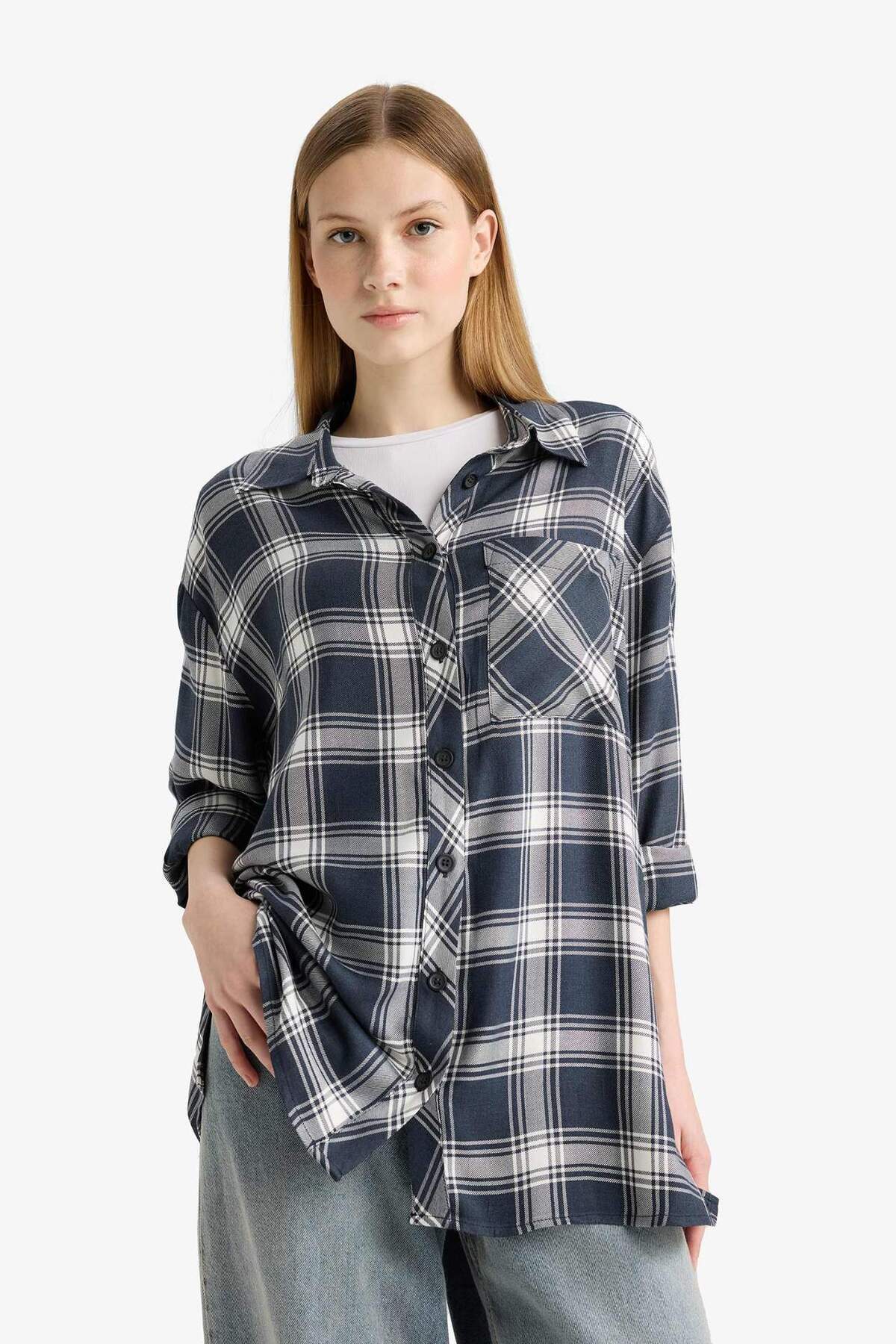 تیشرت آستین بلند طرح چهارخانه گشاد سایز بزرگ از جنس فلانل مدل E4593AX25SP