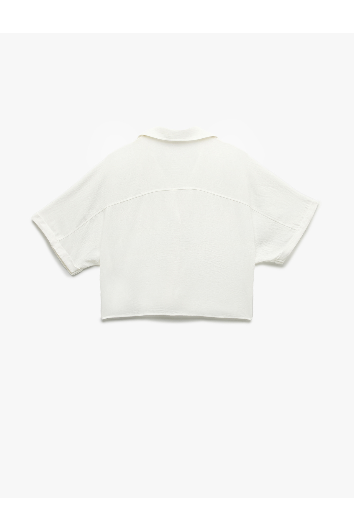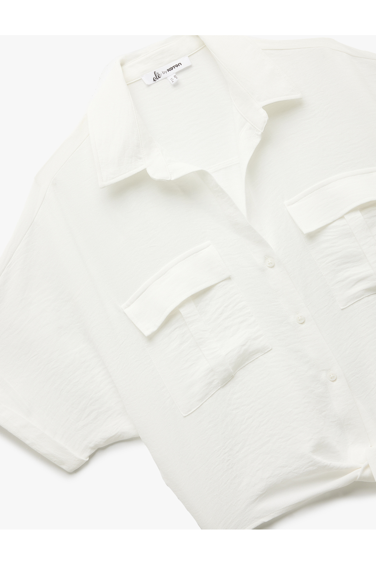 یقه کراواتی کلاسیک آستین کوتاه، بلوز گشاد کوتاه جیبدار.