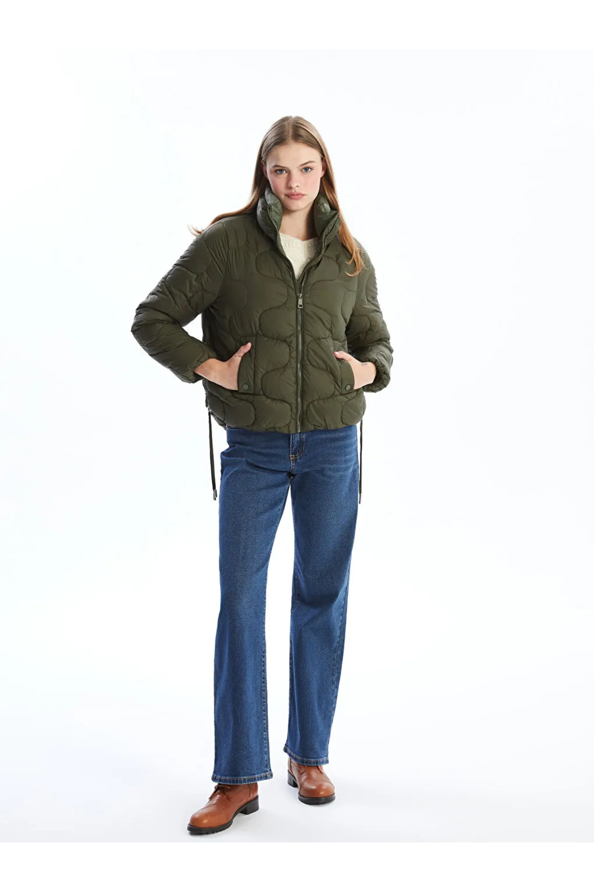 کاپشن پافر زنانه طرح‌دار یقه ایستاده خاکی LCW Vision