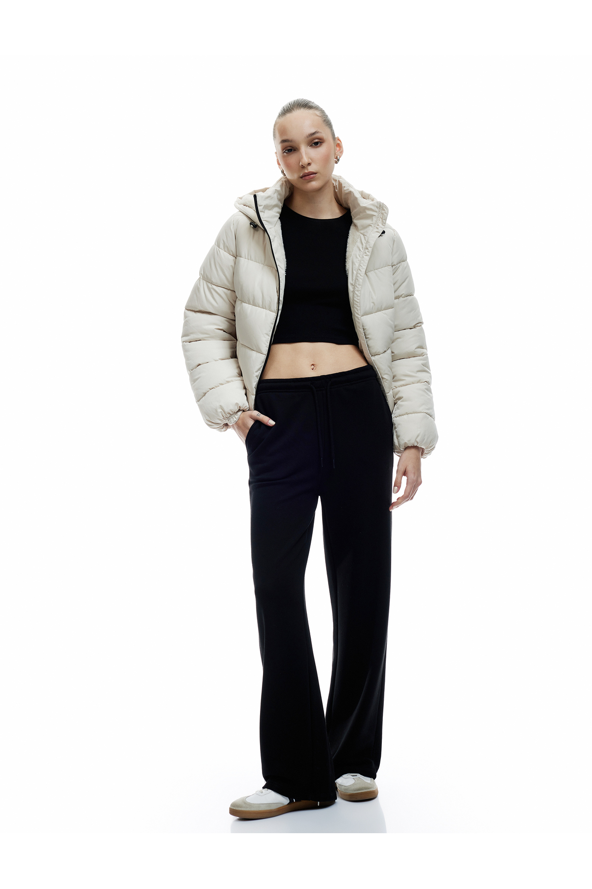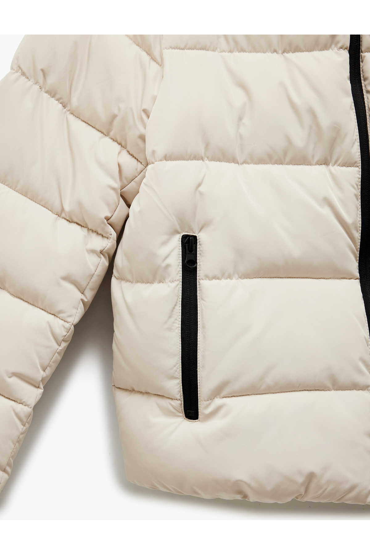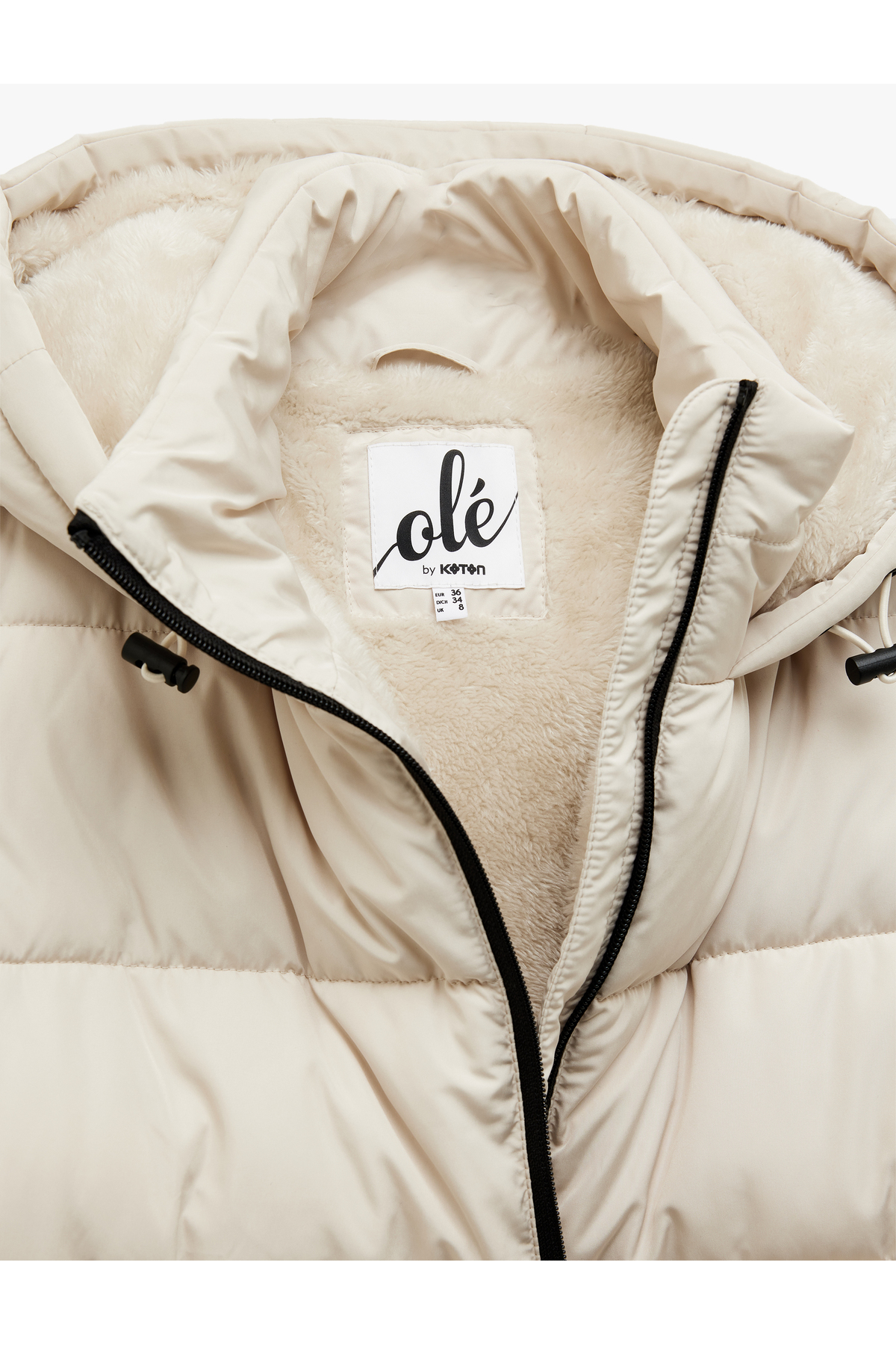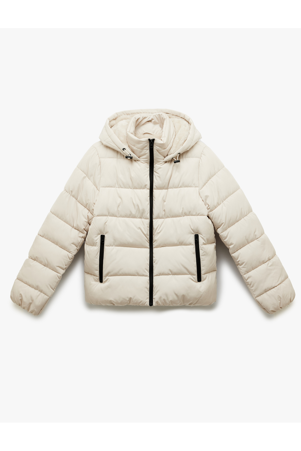 کاپشن پفی، آستین بلند، کلاهدار، آستر خز مصنوعی، زیپدار و جیبدار.