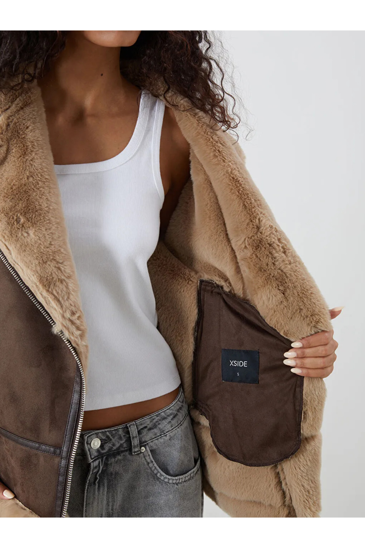 کت زنانه یقه خزدار XSIDE بژ با طرح جیر