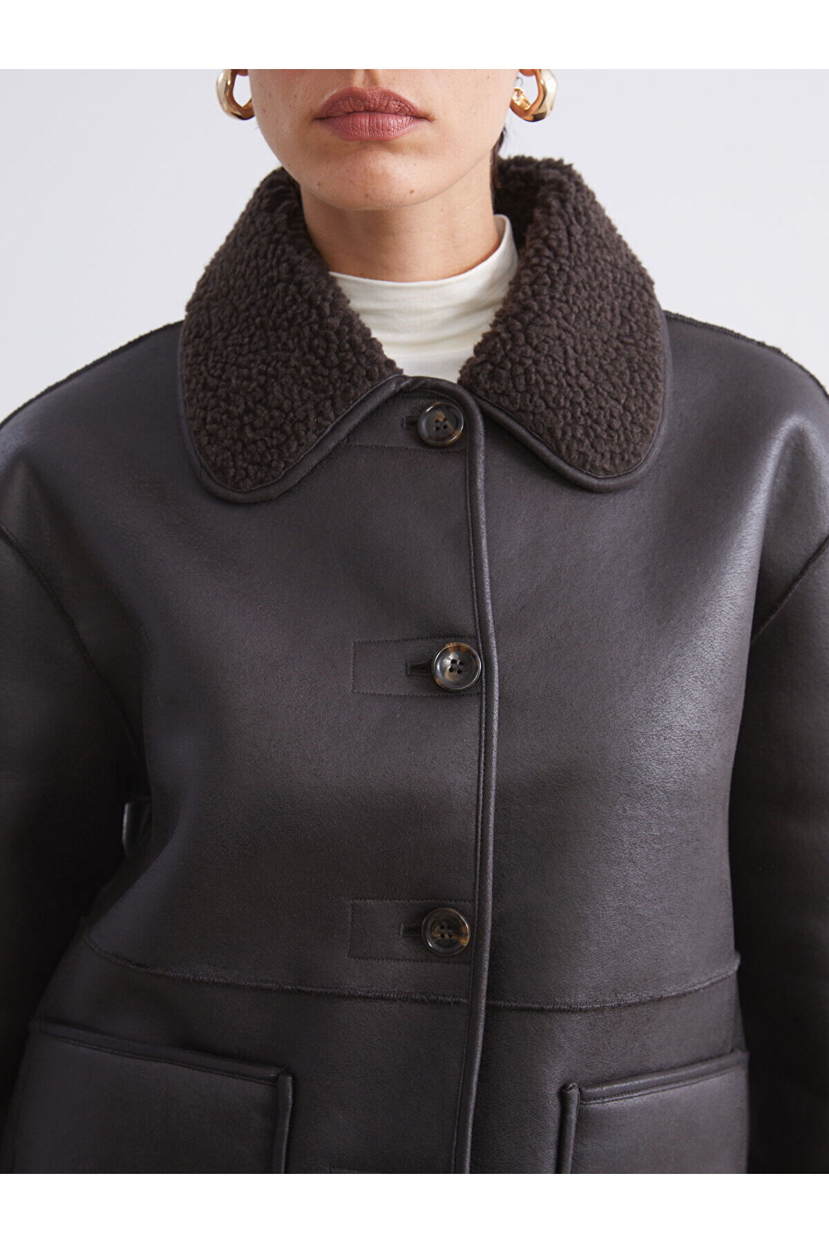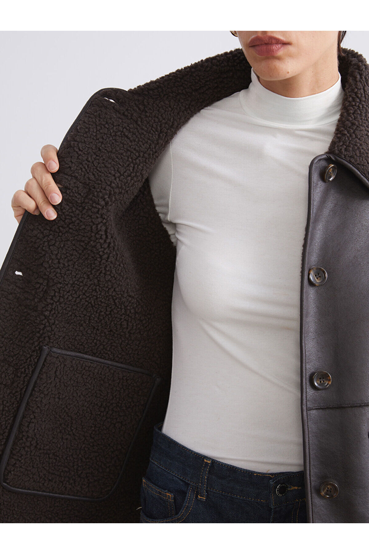 کاپشن چرم زنانه یقه گرد قهوه ای LCW Vision