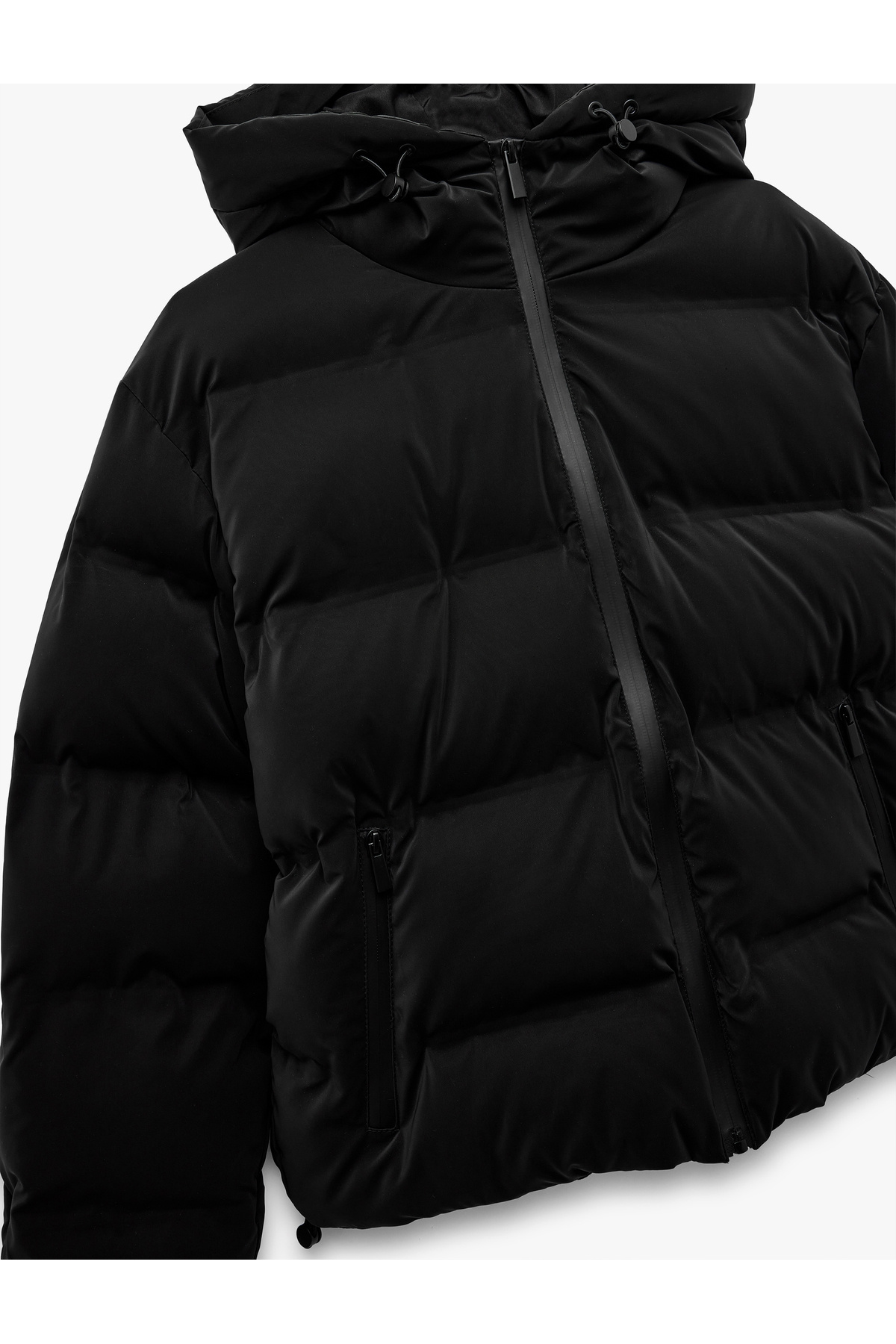 کاپشن پفی، کلاهدار، آستین بلند، زیپدار، جیبدار و ضد آب.