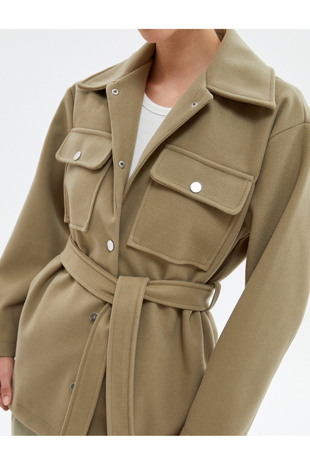 ژاکت کشمیری با جیب‌های کناری، کمر بنددار و بسته شدن با دکمه