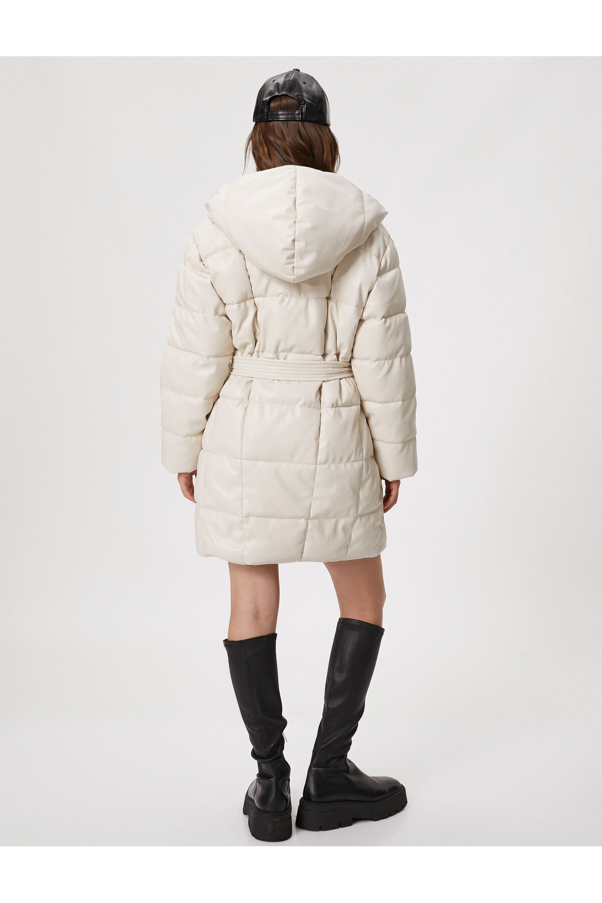 کاپشن بلند پددار با ظاهر چرمی، کلاه، جزئیات کمربند، جیب و دوخت لحافی