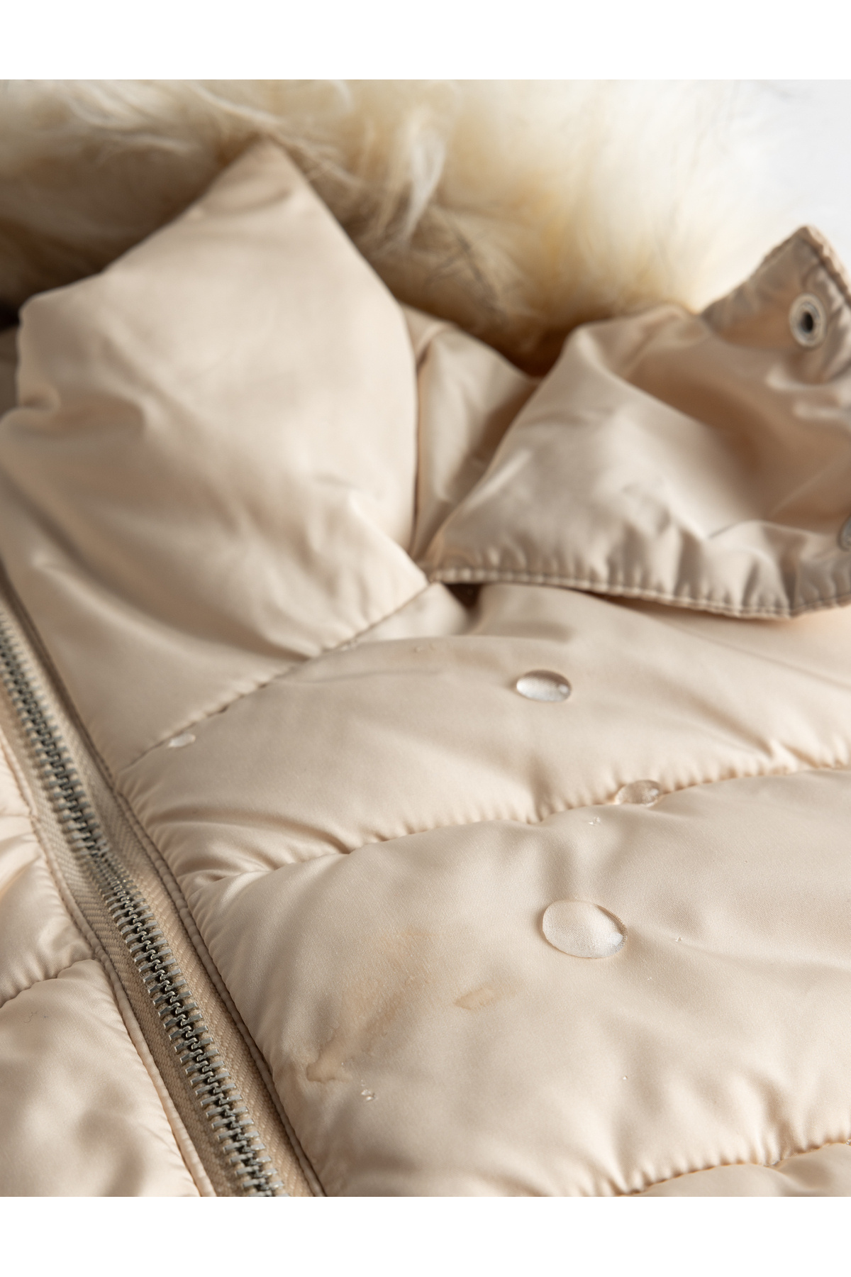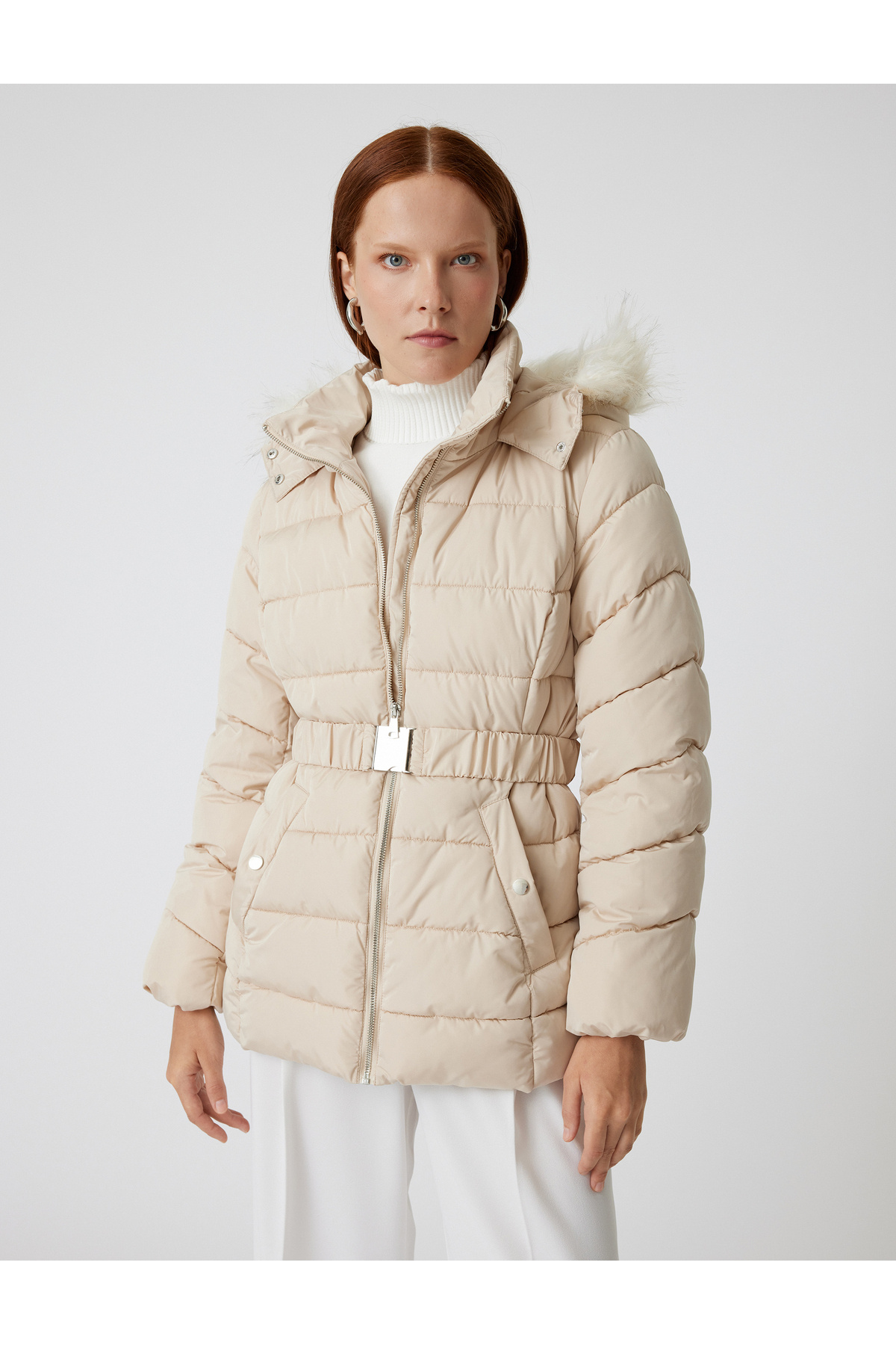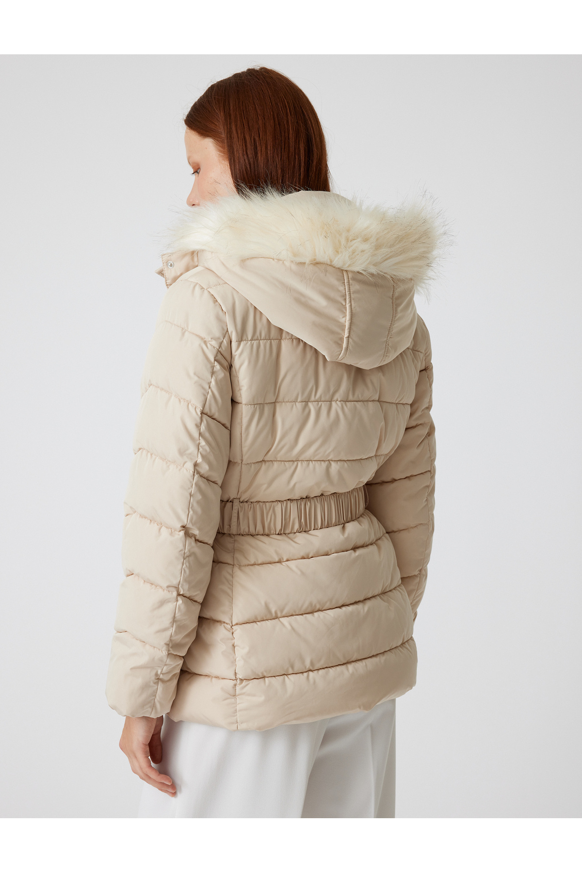 کاپشن پفی لحافی با کلاه، یقه خز مصنوعی و کمربند
