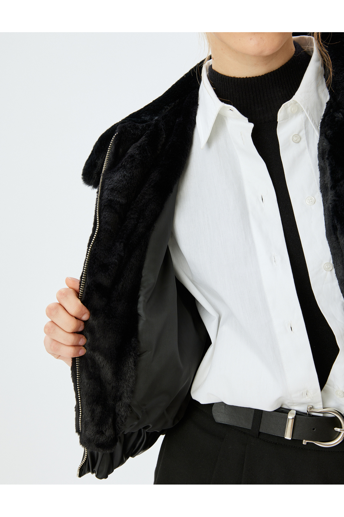 یقه ایستاده، کاپشن زیپدار با جزئیات جیبدار و خز مصنوعی.