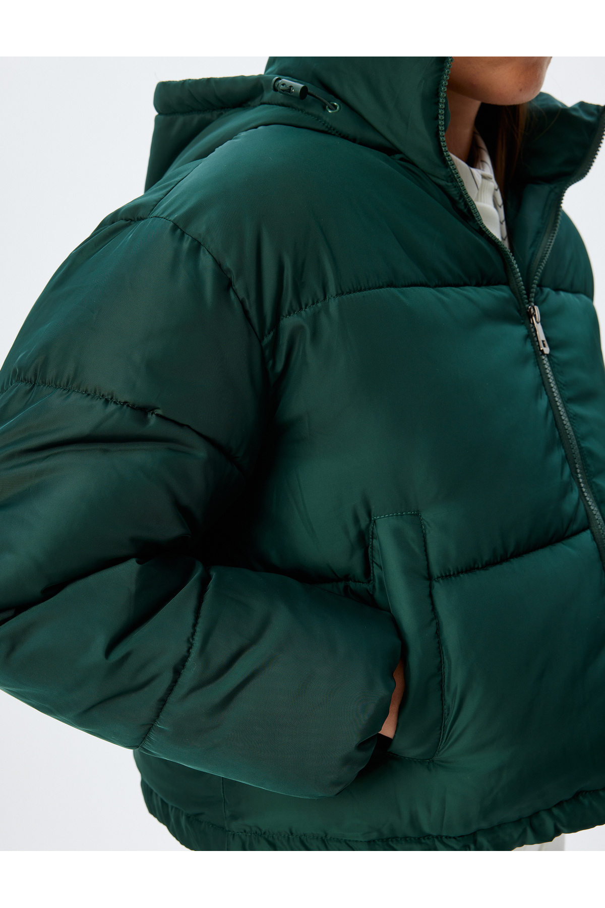 کاپشن پفی کوتاه کلاهدار، جیبهای زیپدار، فرم راحت