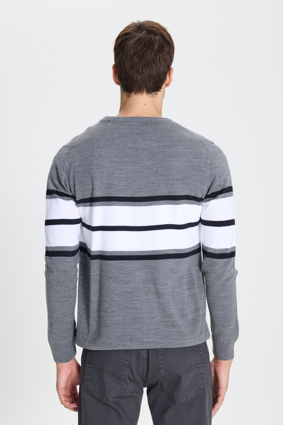 ژاکت بافتنی راه راه یقه گرد برش معمولی خاکستری-اکرو سایز استاندارد
