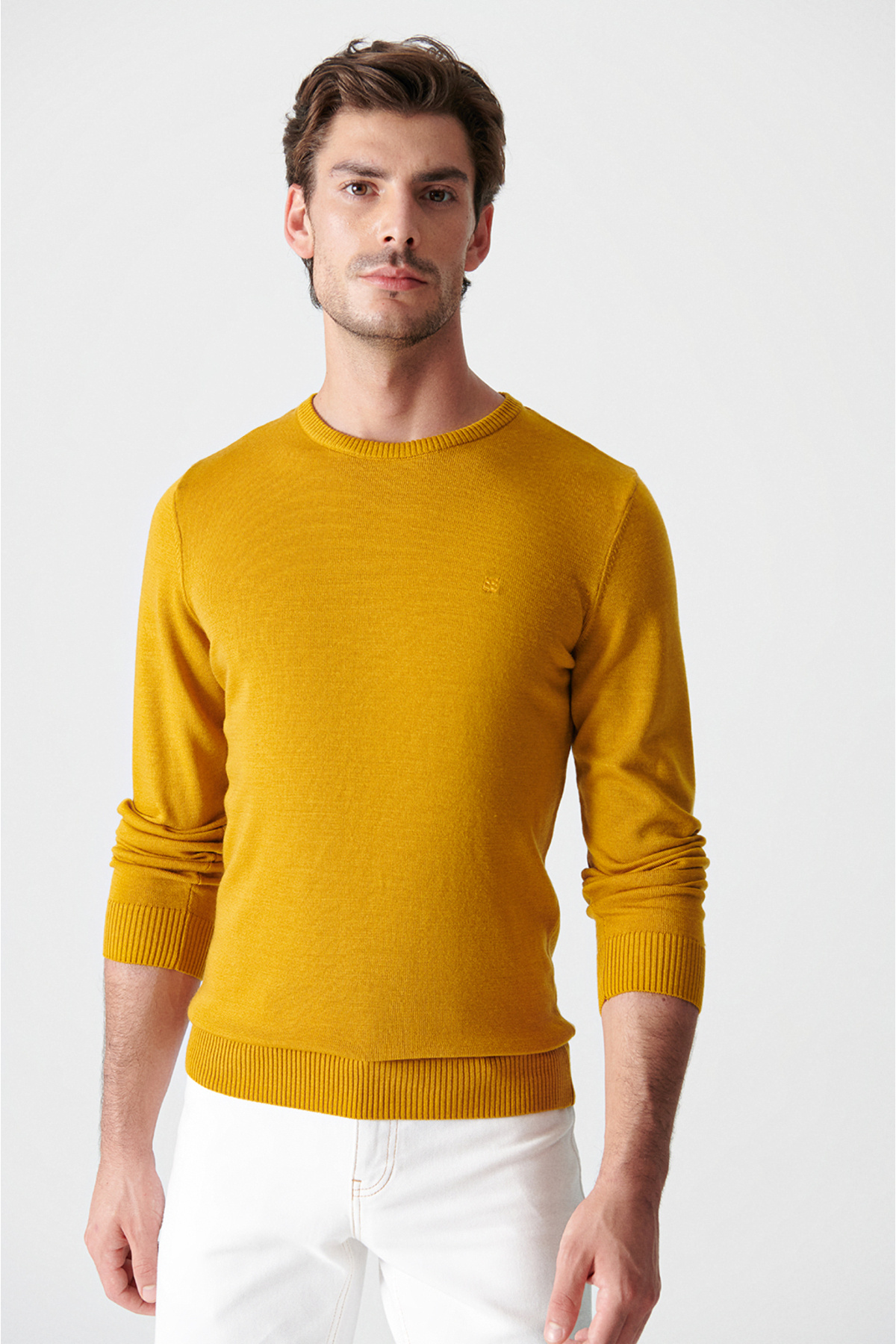 ژاکت بافتنی مردانه یقه گرد بدون پرز، رنگ خردلی، سایز معمولی E005000