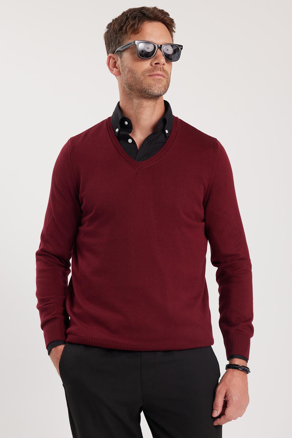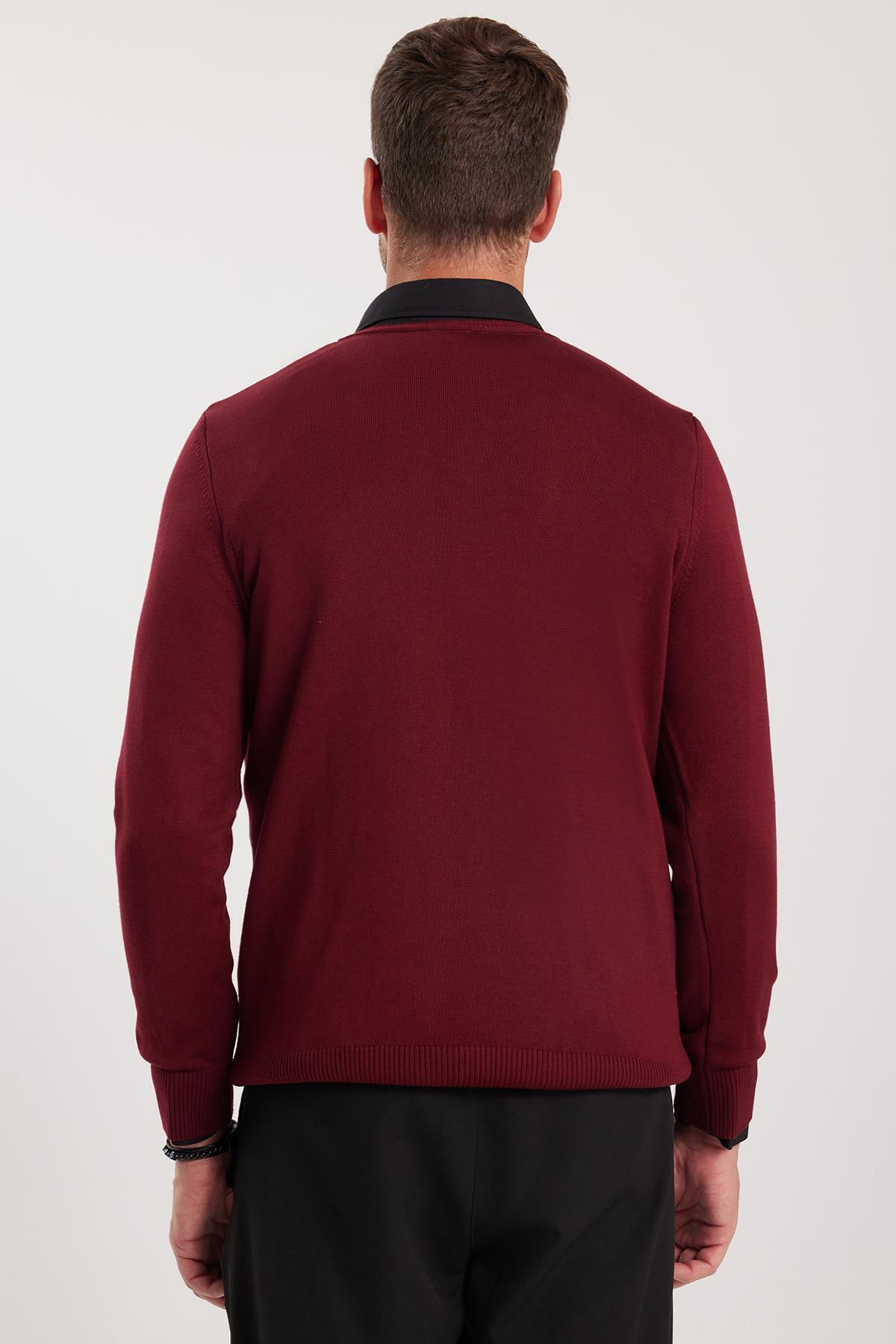 ژاکت بافتنی مردانه یقه هفت با برش معمولی و طرح استاندارد فیت، نخی، زرشکی