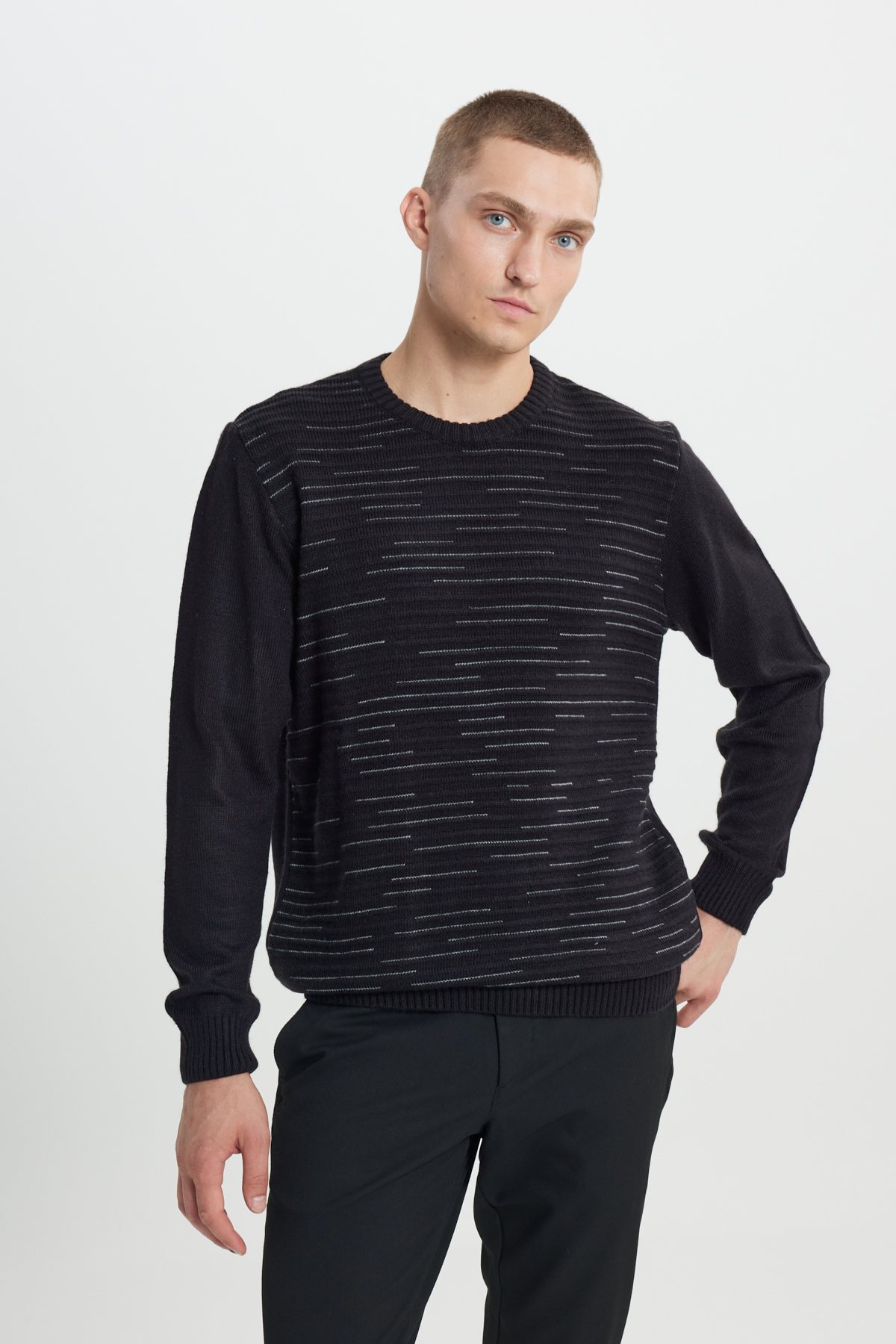 ژاکت بافتنی مردانه طرح‌دار، طرح‌دار، یقه گرد، برش معمولی، ملانژ، مشکی-خاکستری، سایز استاندارد