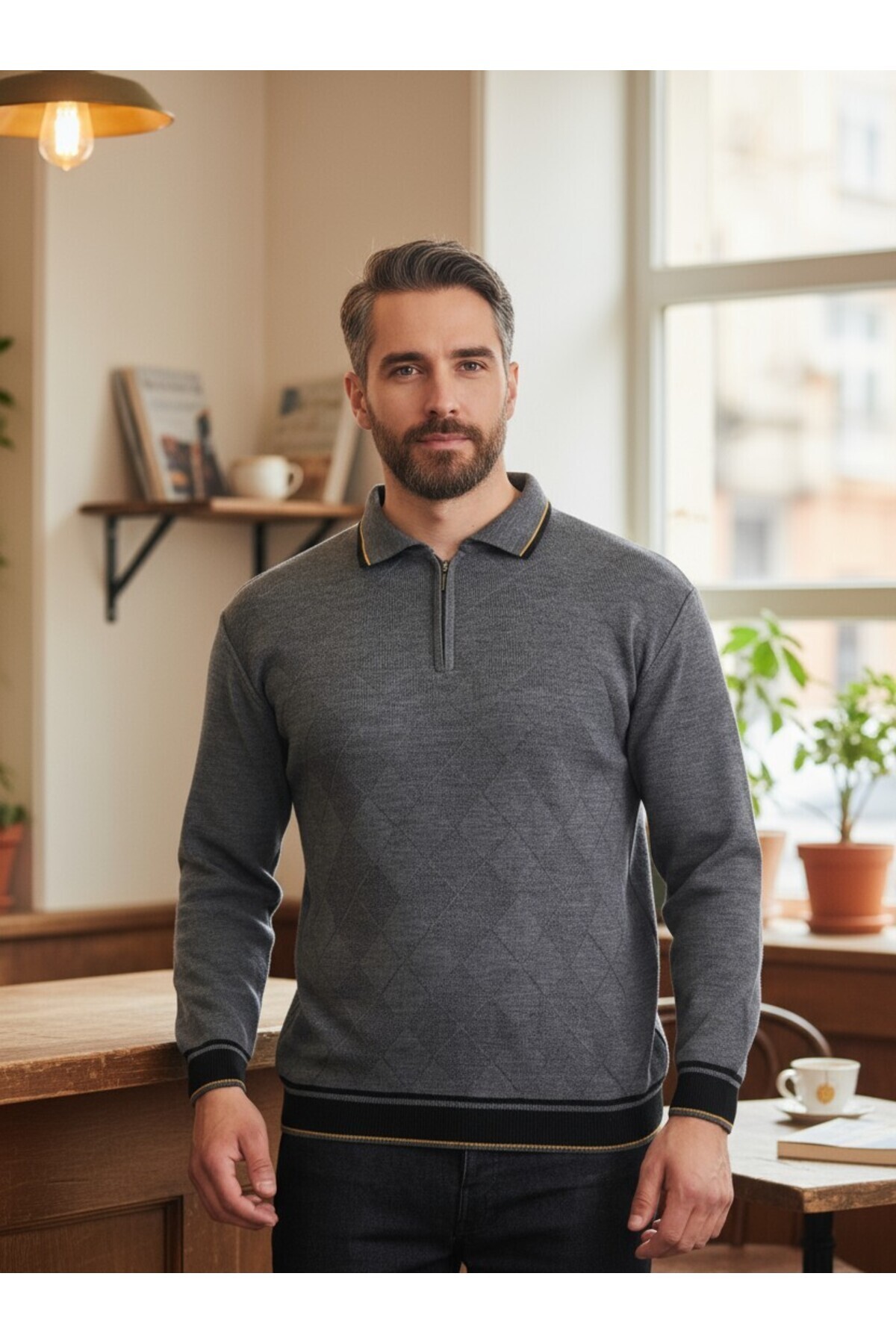 پیراهن مردانه خاکستری بافتنی استیل جلو بافت با یقه پولو زیپ دار، پلیور بافتنی زمستانی بدون پرز