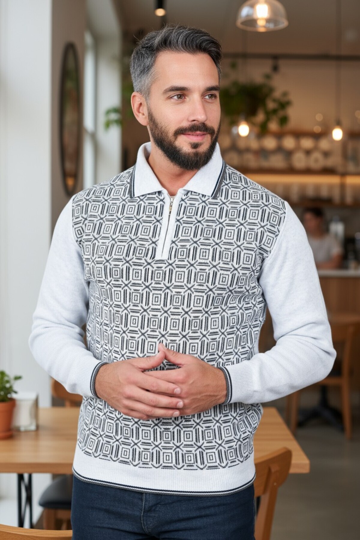 پیراهن مردانه طرح مربع بافتنی استیل، یقه اسکی، یقه پولو زیپدار، ژاکت بافتنی بدون پرز، مناسب برای پدر و مادر در زمستان