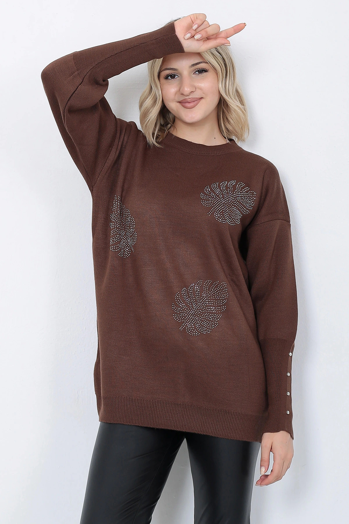 ژاکت بافتنی زنانه، یقه گرد، طرح برگ، آستینهای تزیین شده، سایز بزرگ، قهوهای