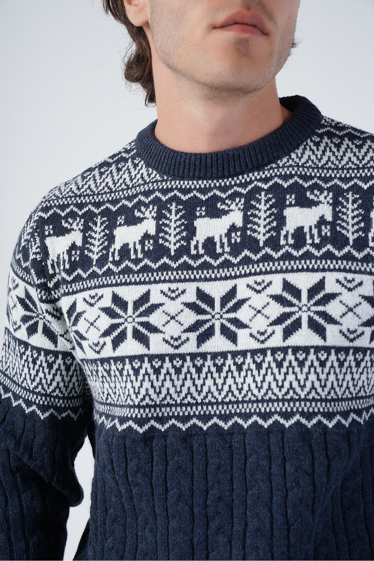 ژاکت پشمی بافتنی مردانه طرح گوزن ژاکارد یقه گرد سرمهای سرمهای