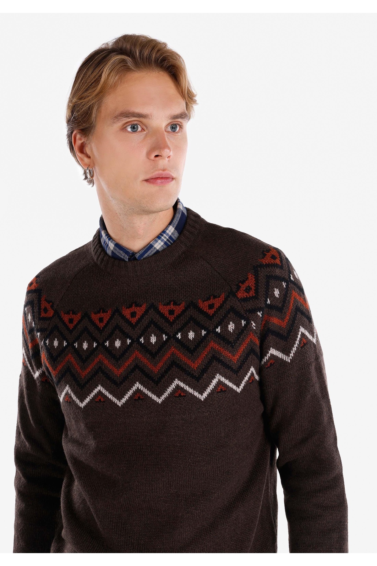 ژاکت مردانه قهوه‌ای طرح ژاکارد یقه گرد معمولی فیت