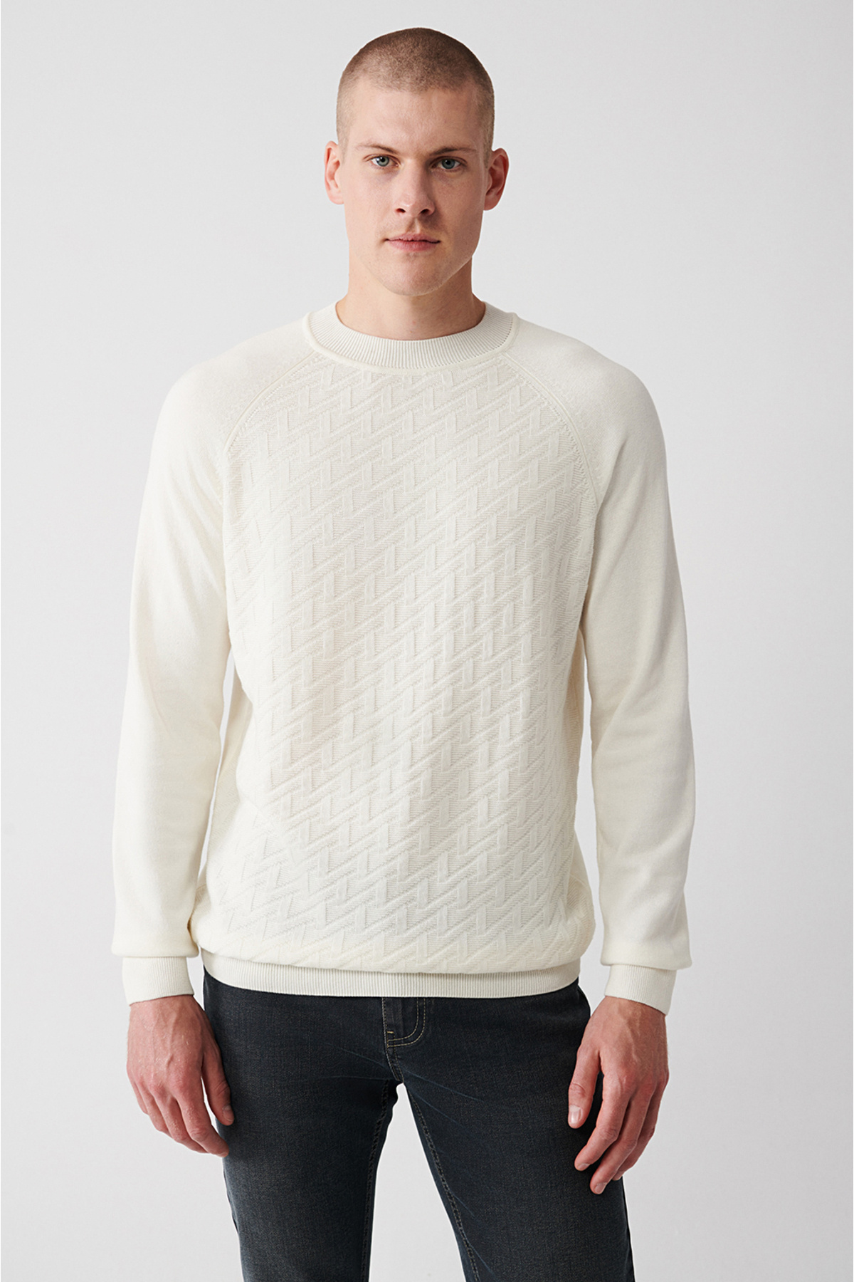 پلیور مردانه یقه گرد سفید طرحدار جلو و آستین رگلان A32Y5155