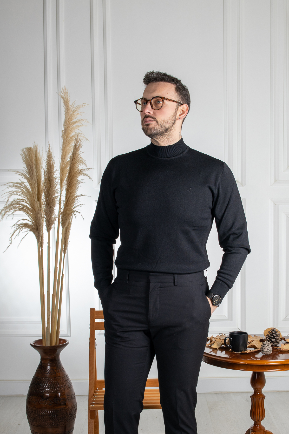 ژاکت بافتنی مشکی طرح ریون سارار، یقه اسکی، مدل مصاحبه