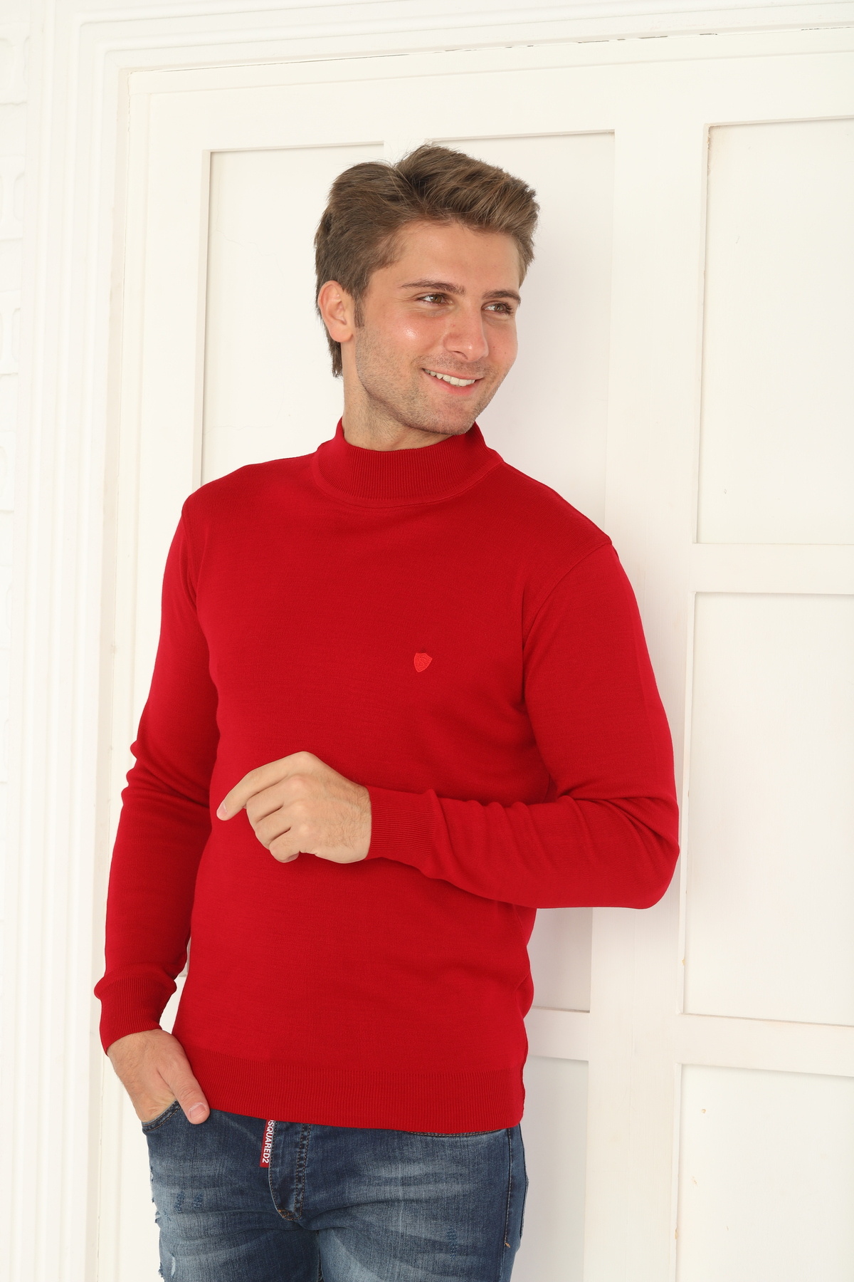 ژاکت بافتنی یقه اسکی مردانه قرمز استاندارد فیت معمولی برشدار