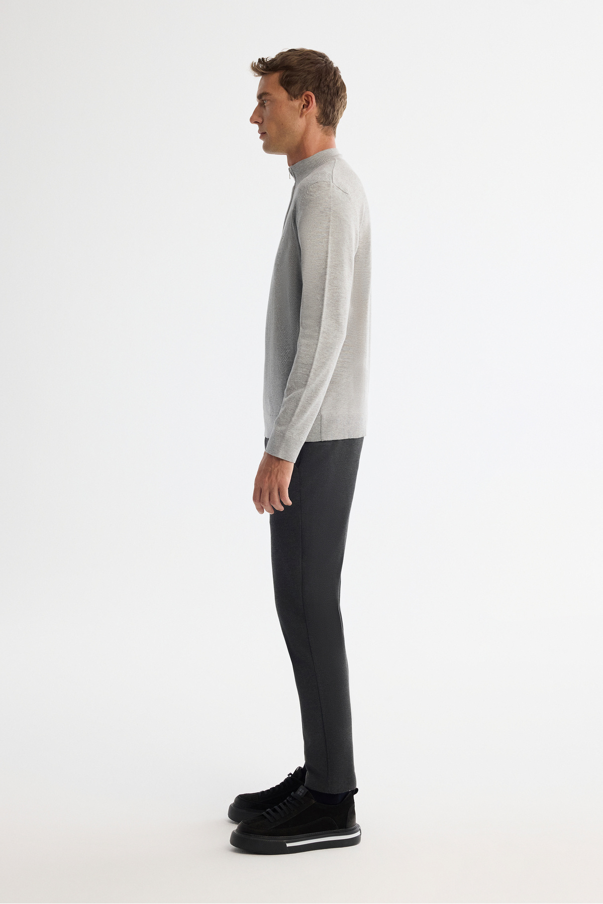 ژاکت بافتنی مردانه خاکستری زیپدار یقه ایستاده، نرم و لطیف، سایز معمولی، A42Y5056