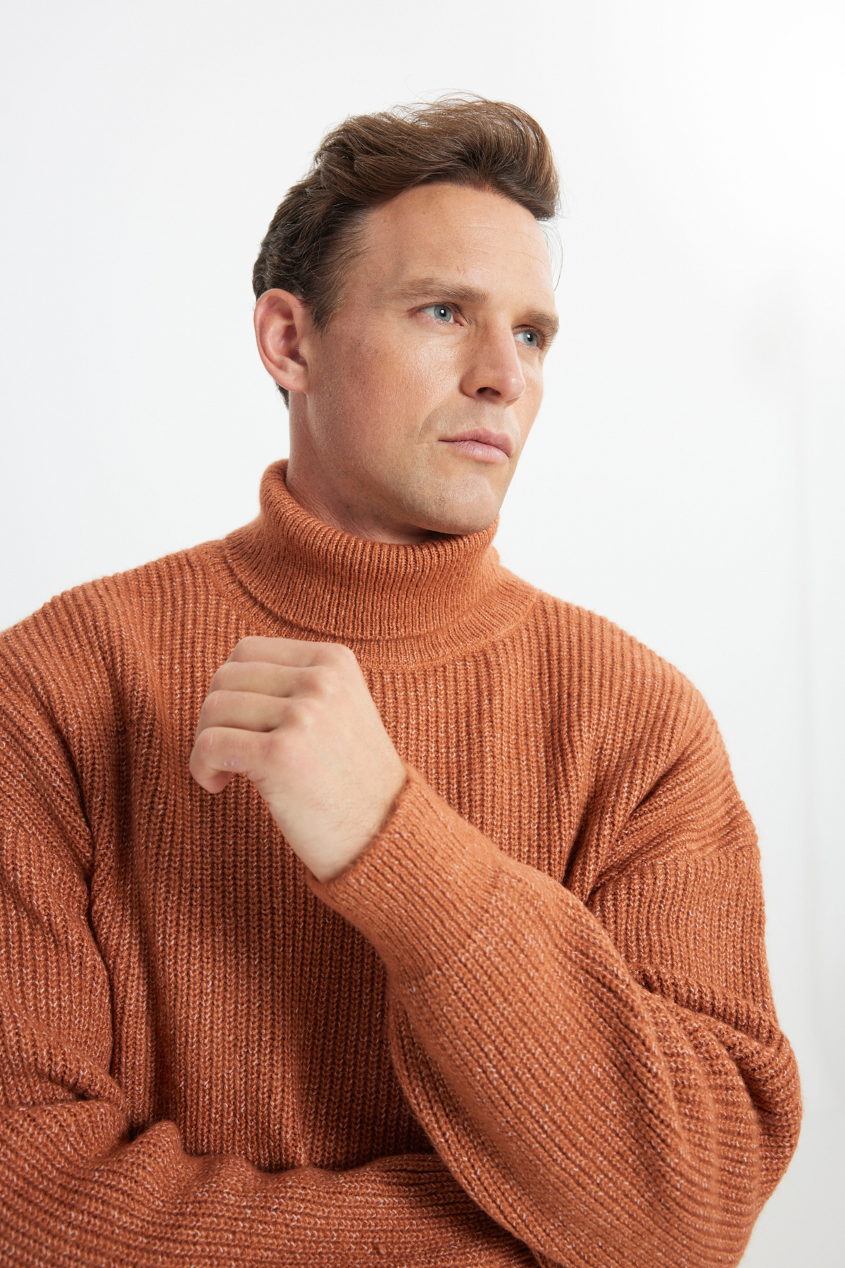 ژاکت بافتنی مردانه گشاد سایز بزرگ دارچینی یقه اسکی طرح دار، بافت نرم و برس خورده