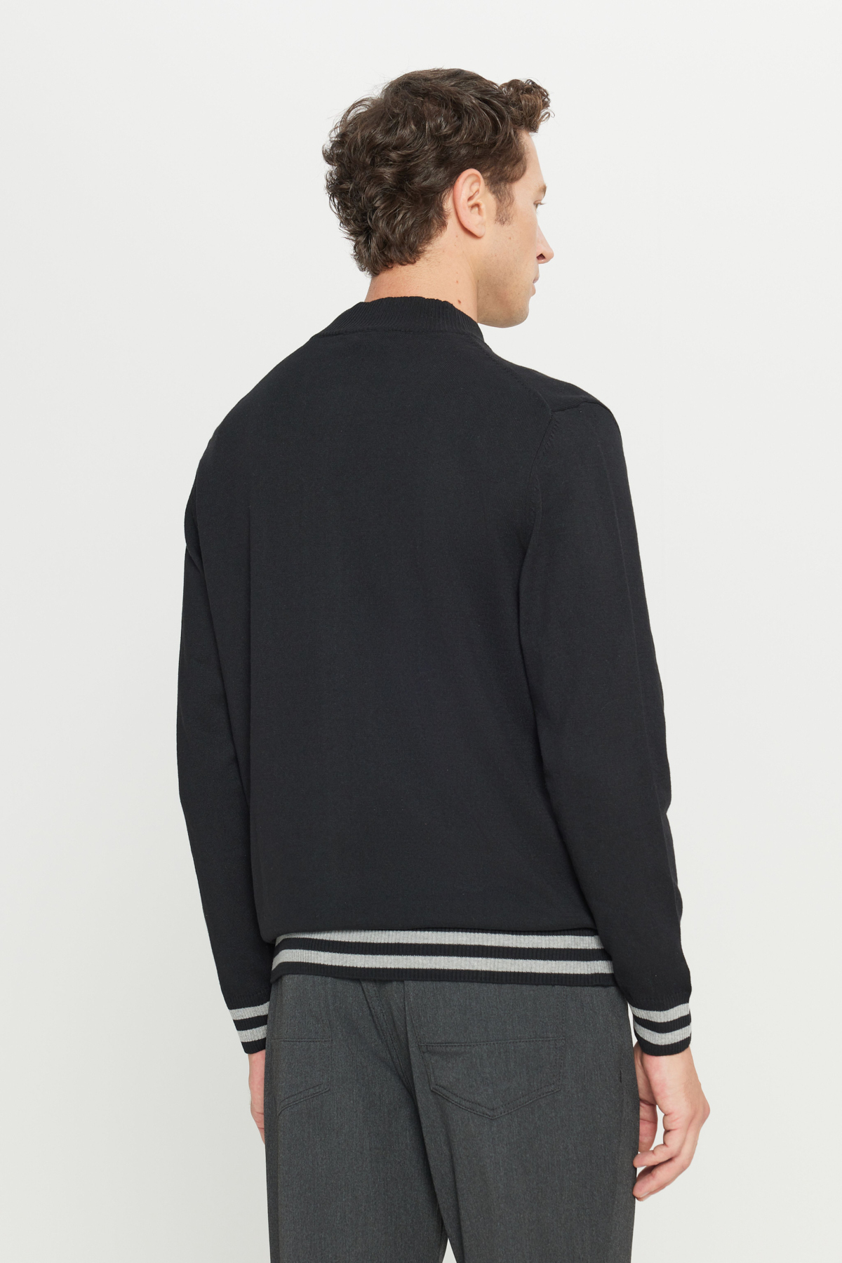 ژاکت بافتنی مردانه یقه ایستاده نخی مشکی زیپدار، سایز استاندارد، برش معمولی