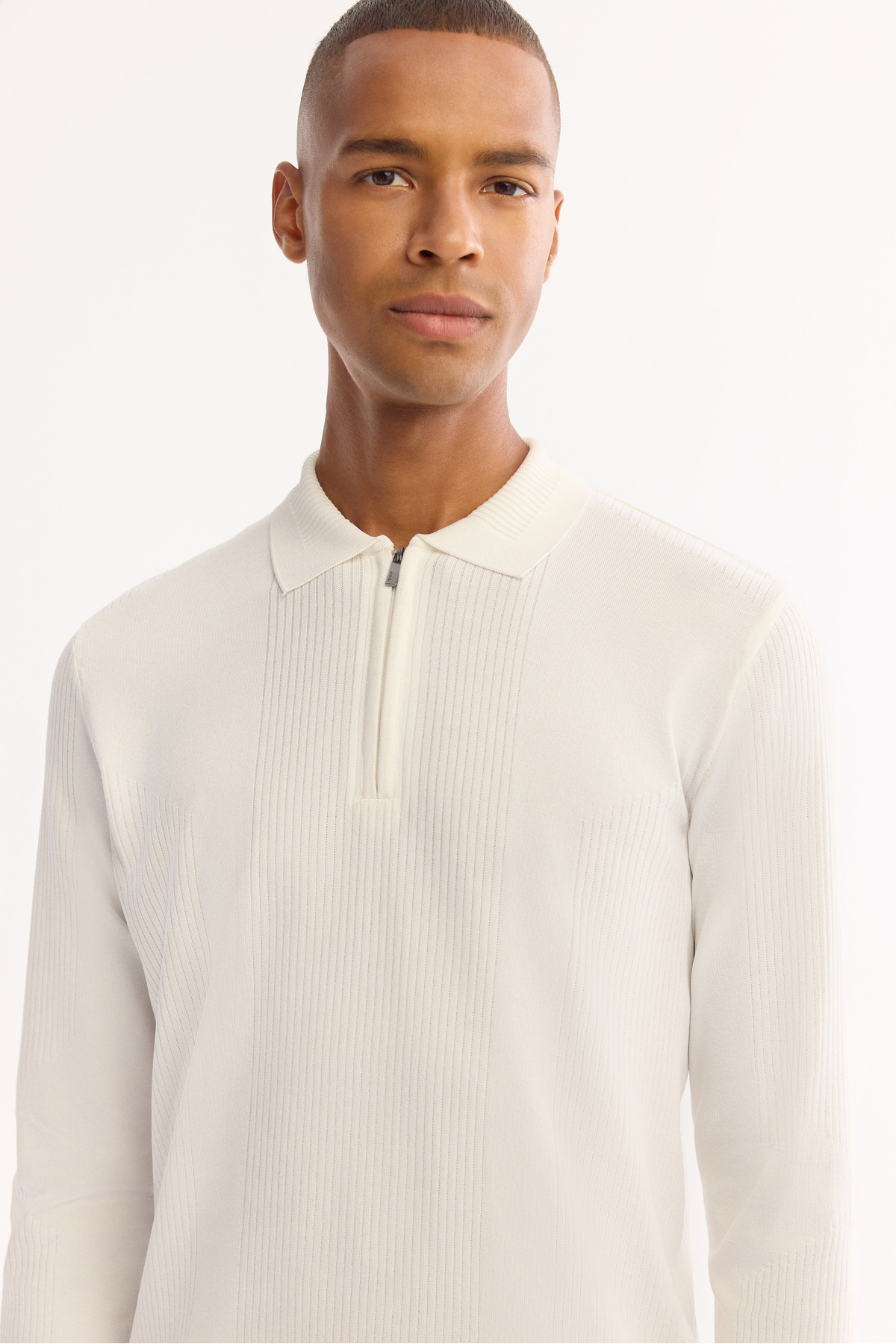 پولو شرت مردانه زیپ‌دار سفید روشن، جنس ابریشم، بافت بدون پرز، سایز معمولی، A52Y5019