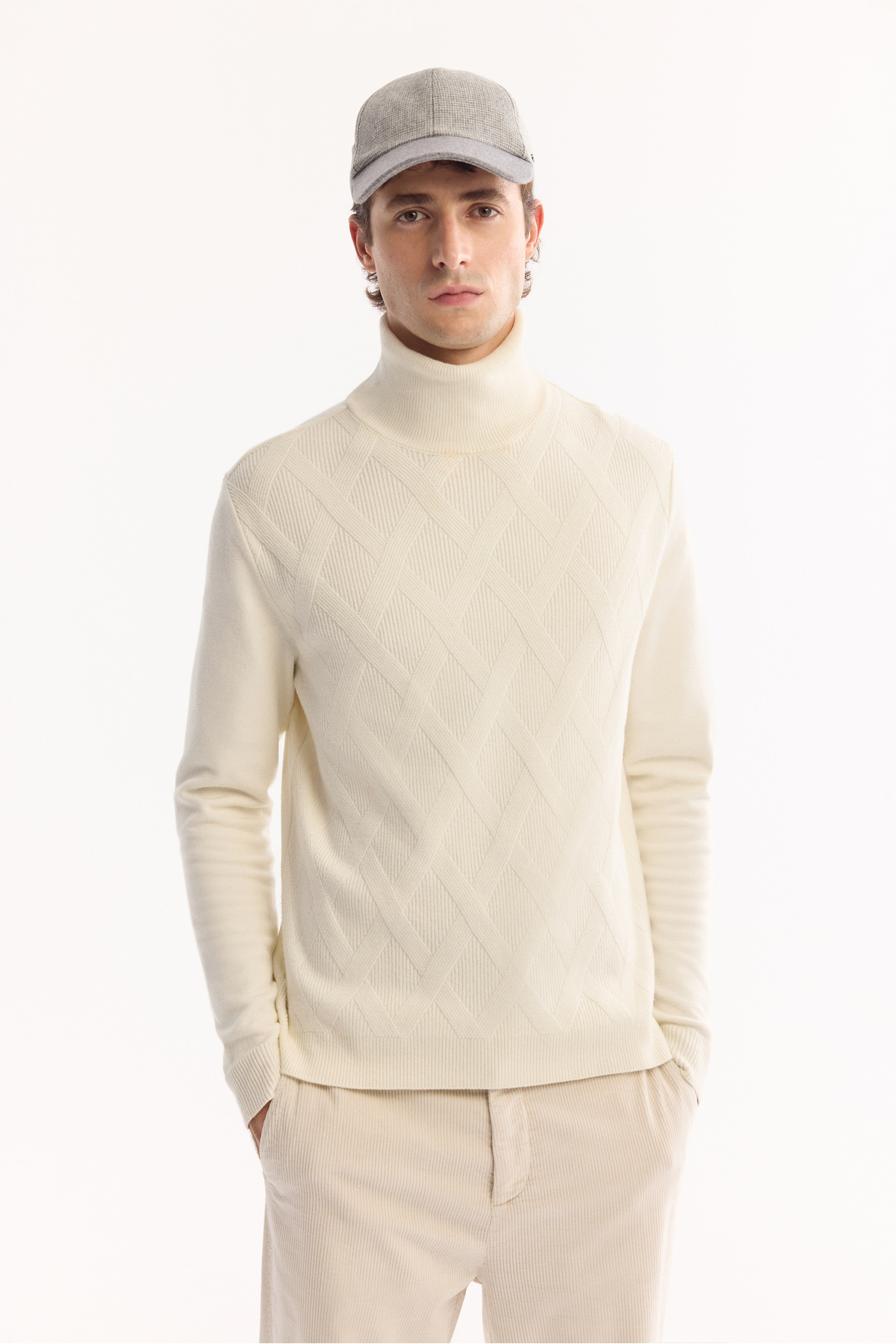 ژاکت بافتنی مردانه یقه اسکی سفید مایل به کرم، بافت نرم و لطیف، سایز معمولی A52Y5040