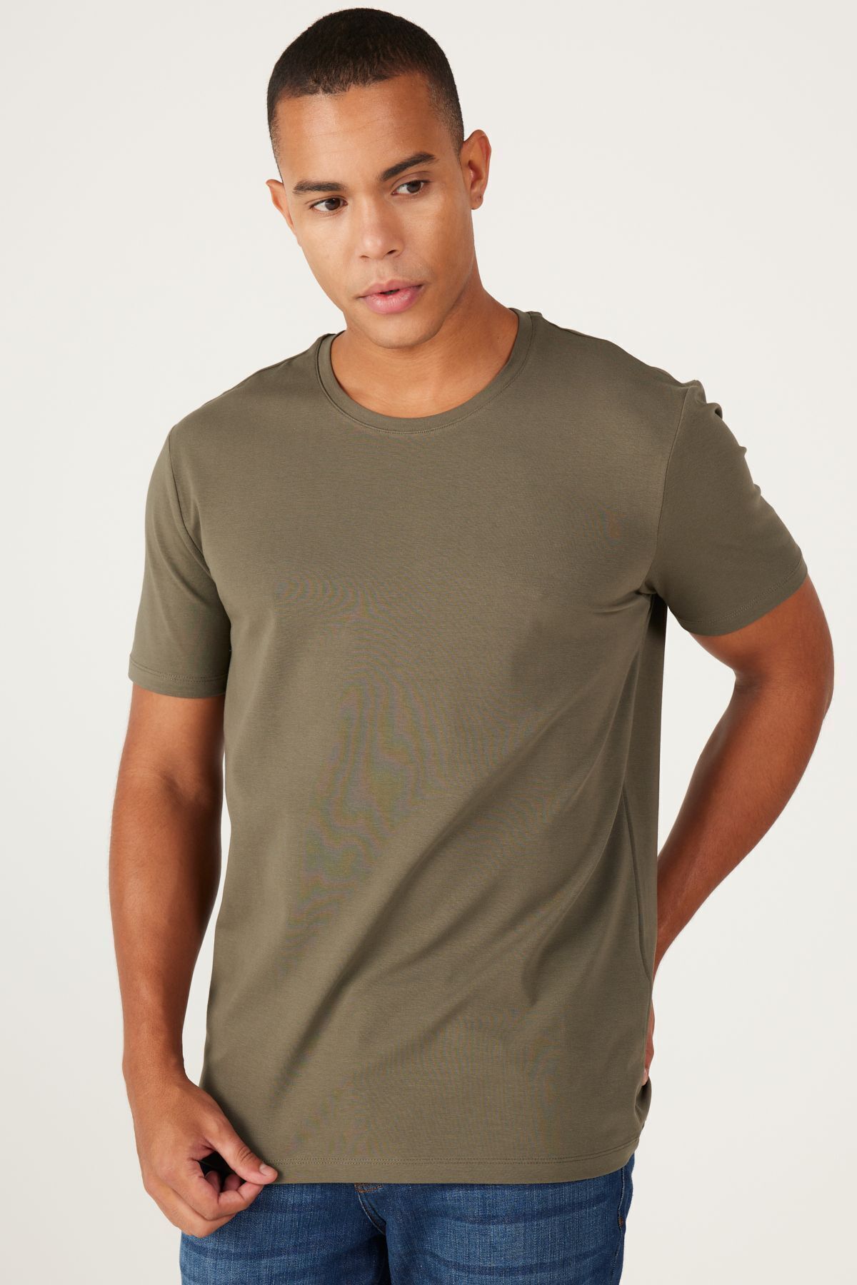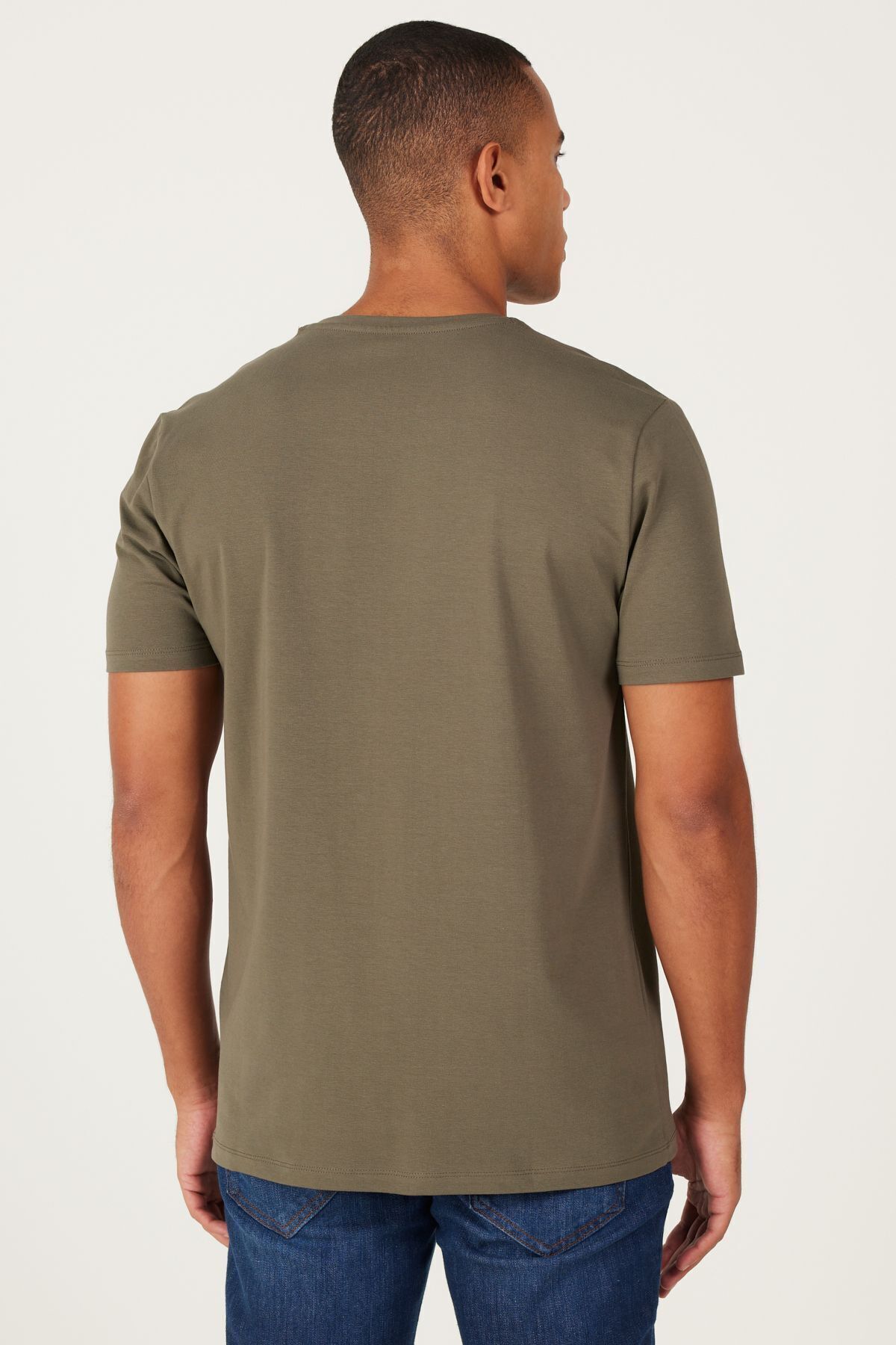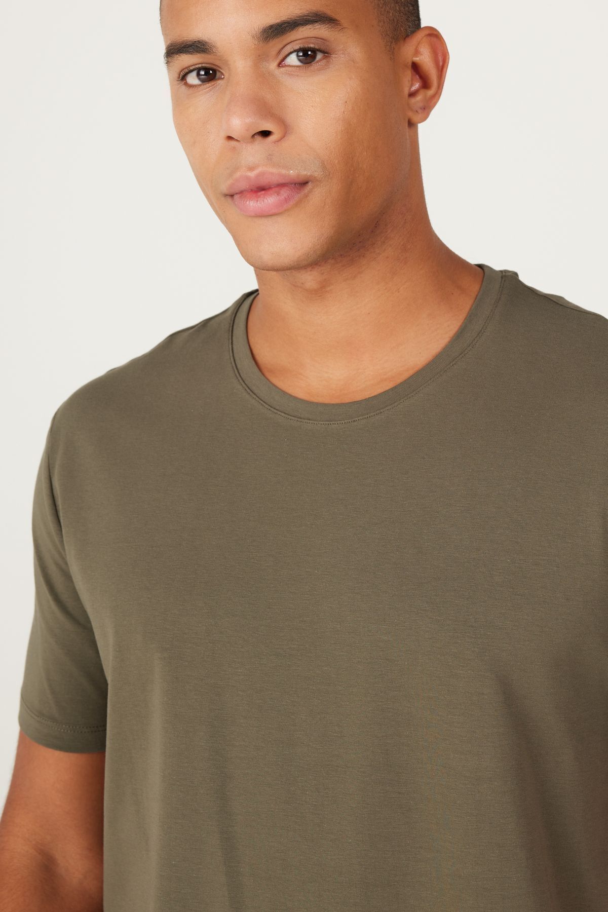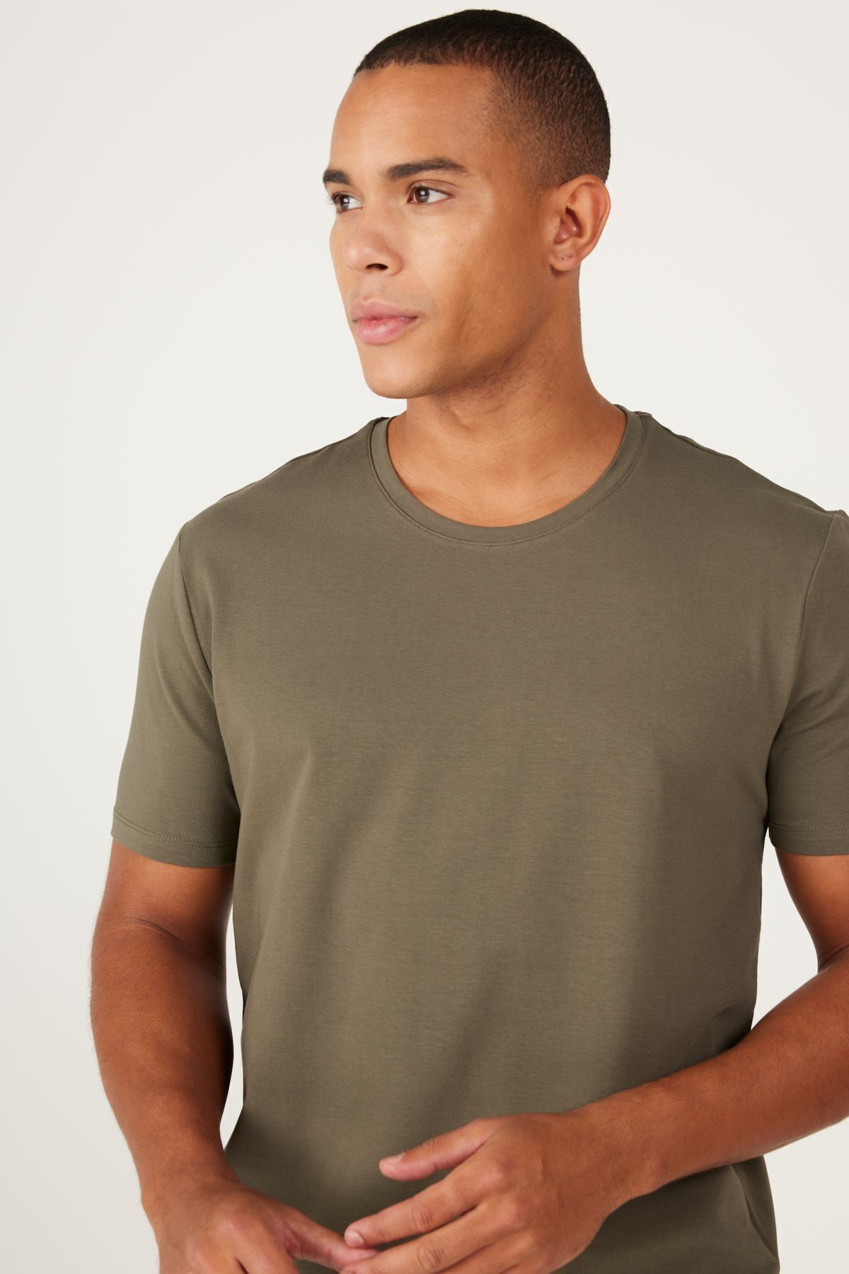 تیشرت یقه گرد مردانه خاکی با کشسانی ۳۶۰ درجه