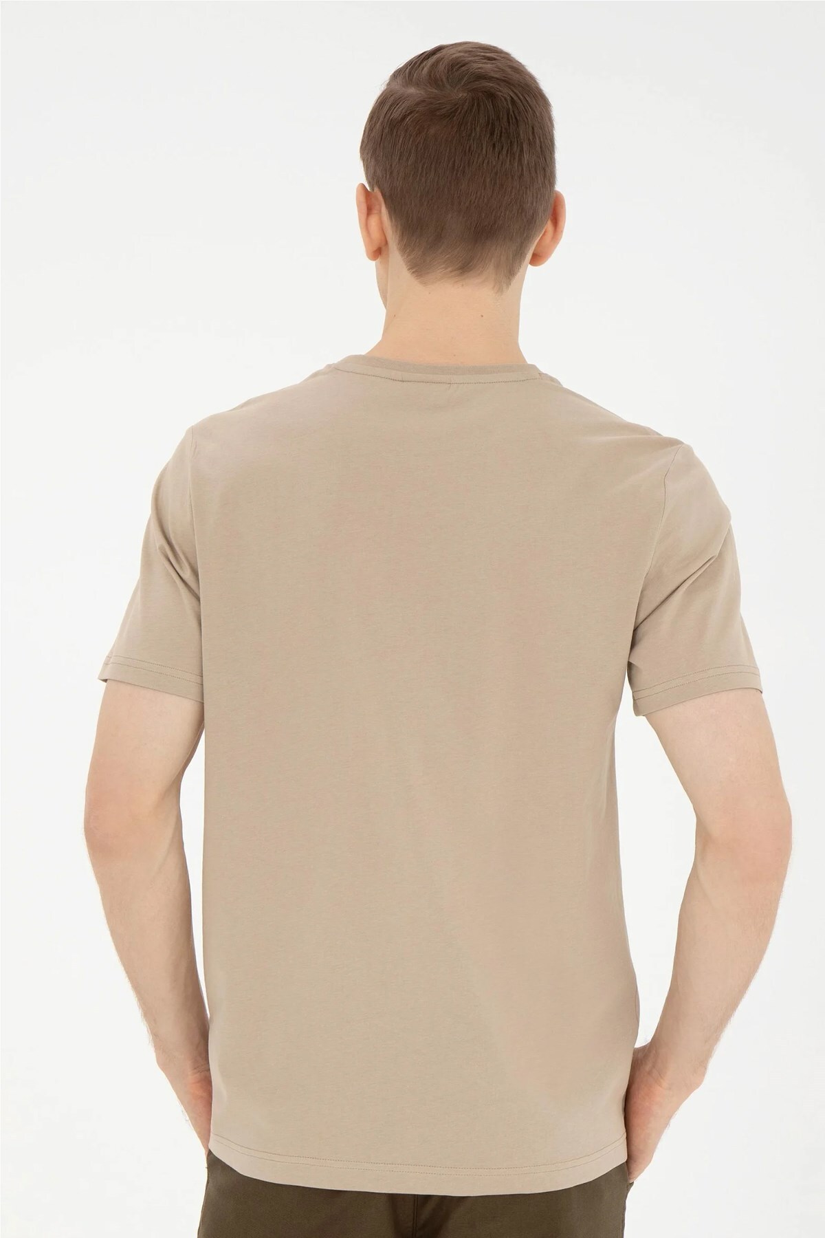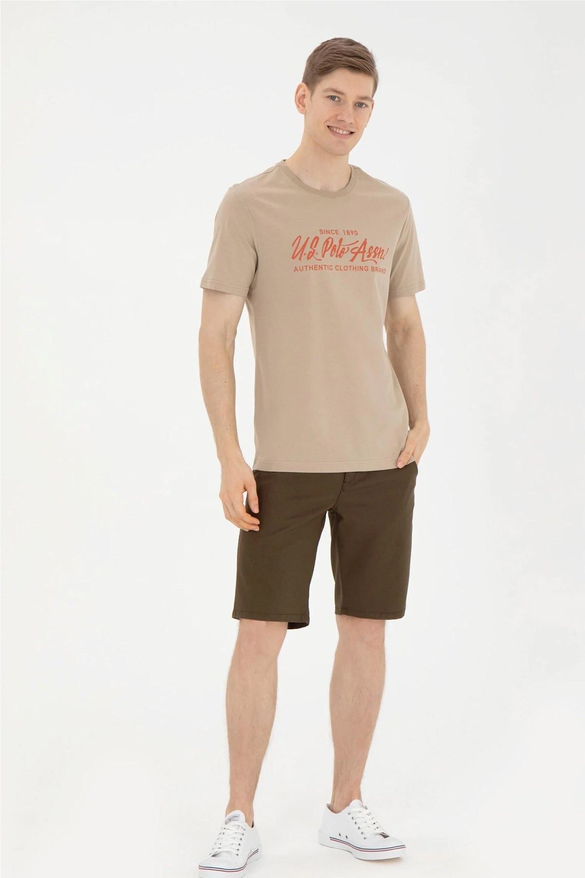 تیشرت یو اس پولو خاکی آستین کوتاه چرم مصنوعی | این تی شرت که با ساختار پارچه ای چرم مصنوعی خود متمایز است، دوام و ظاهری شیک را در کنار هم ارائه می دهد.