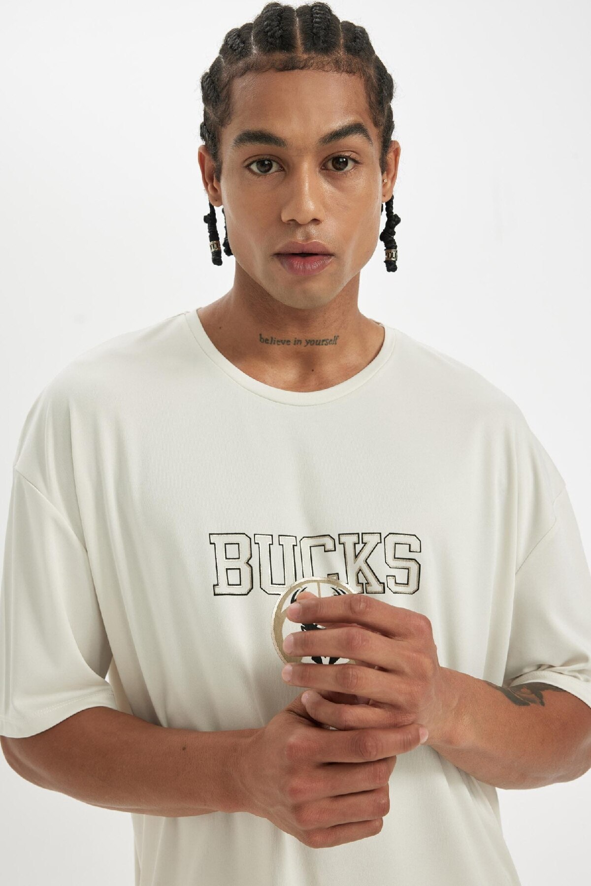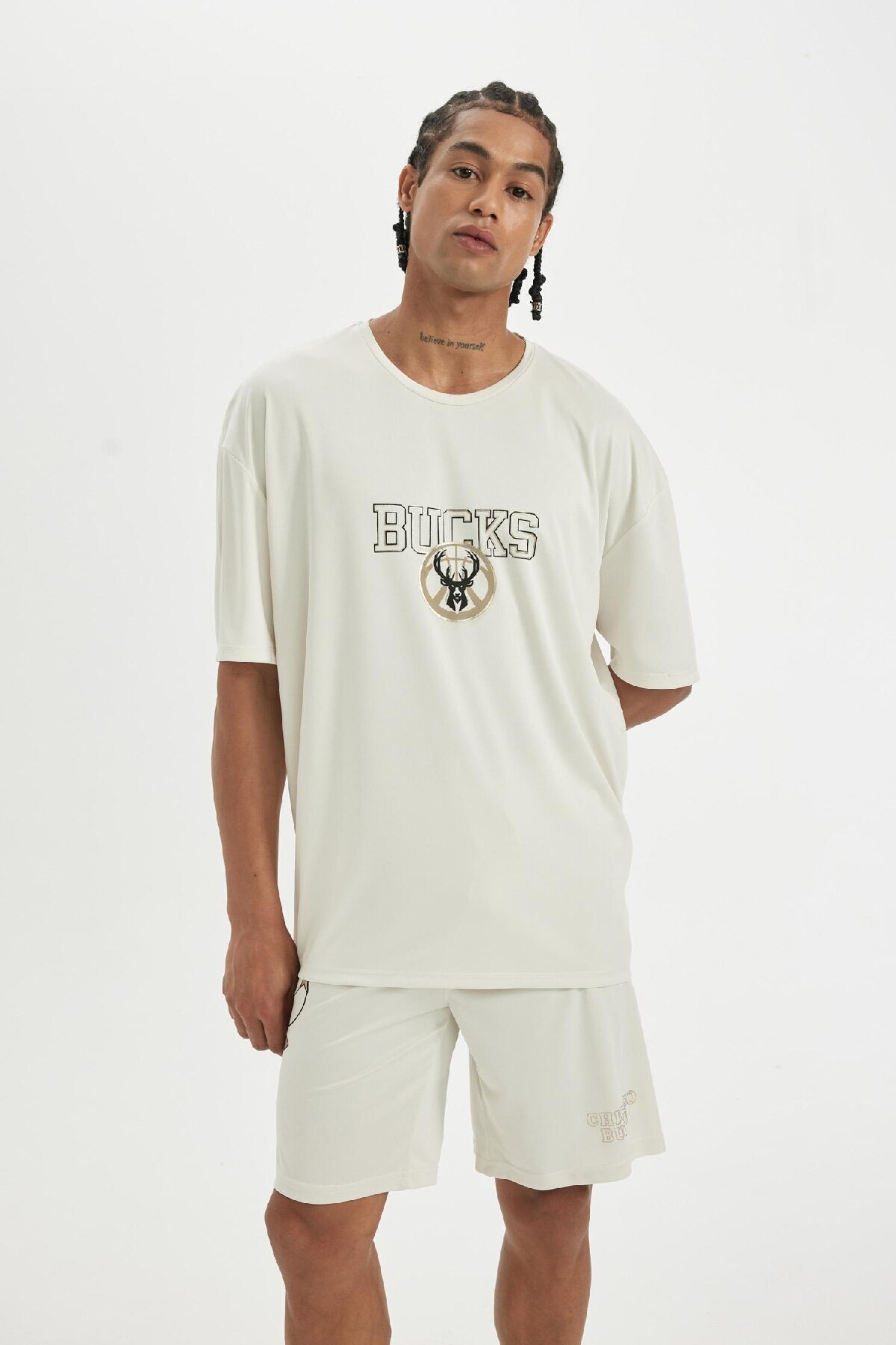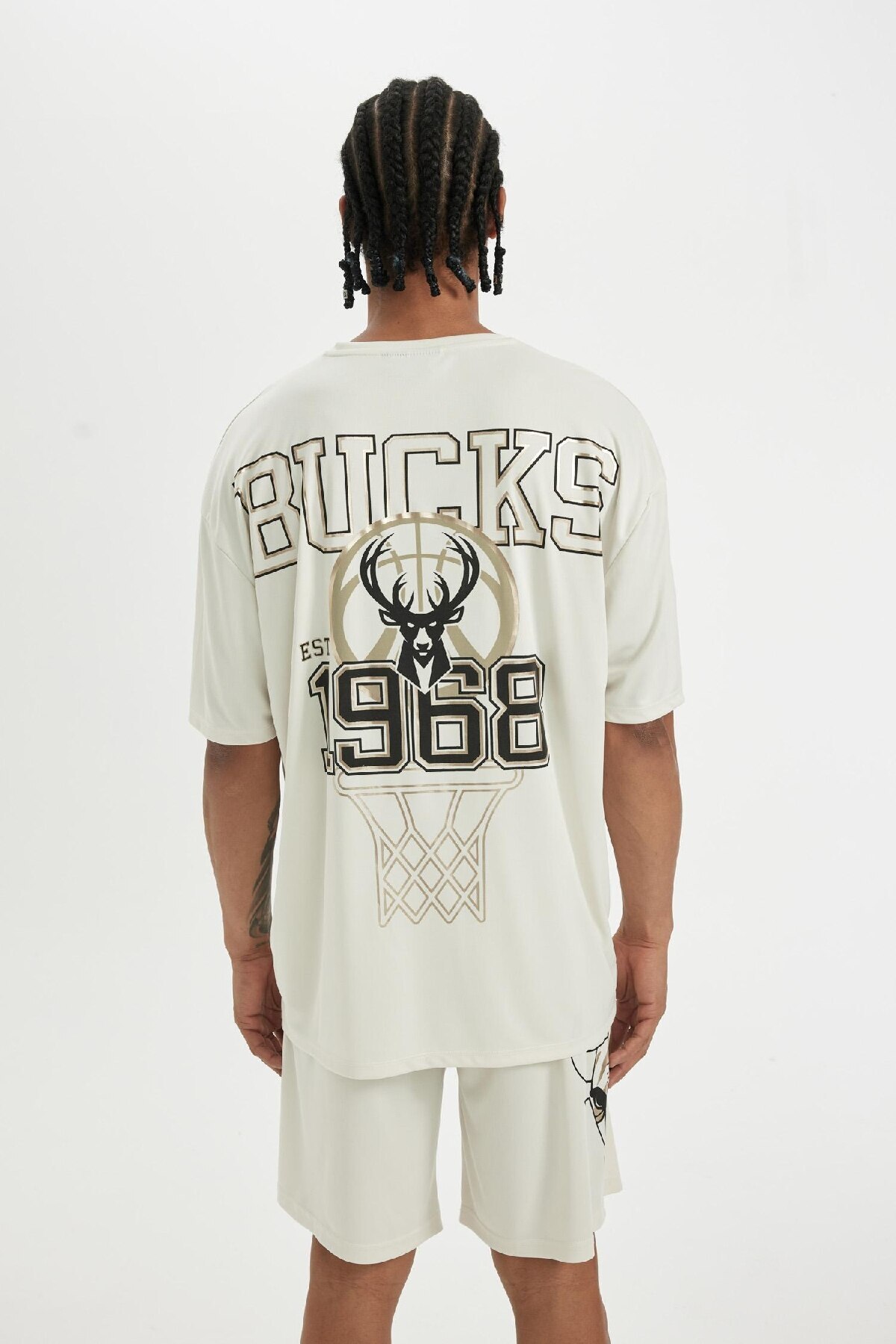 تیشرت دفاکتو بژ آستین کوتاه پارچه | تی شرت آستین کوتاه پارچه ای یقه سنگین DeFactoFit NBA Milwaukee Bucks، ترکیبی عالی از سبک و راحتی.