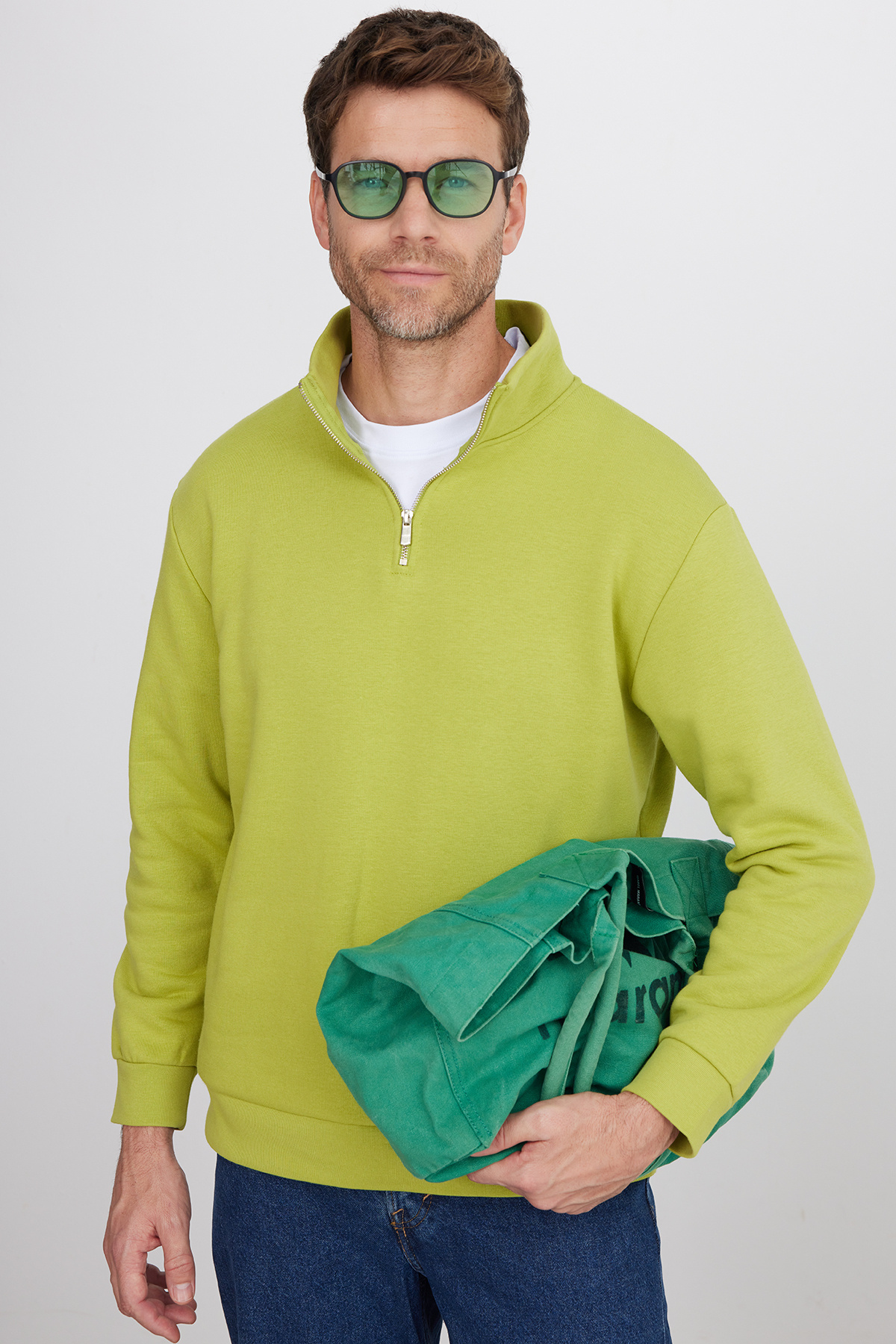 سویشرت یقه ایستاده سبز رنگ، نیم زیپ، مناسب برای هر دو جنس، راحت، نخی، آستر پشمی
