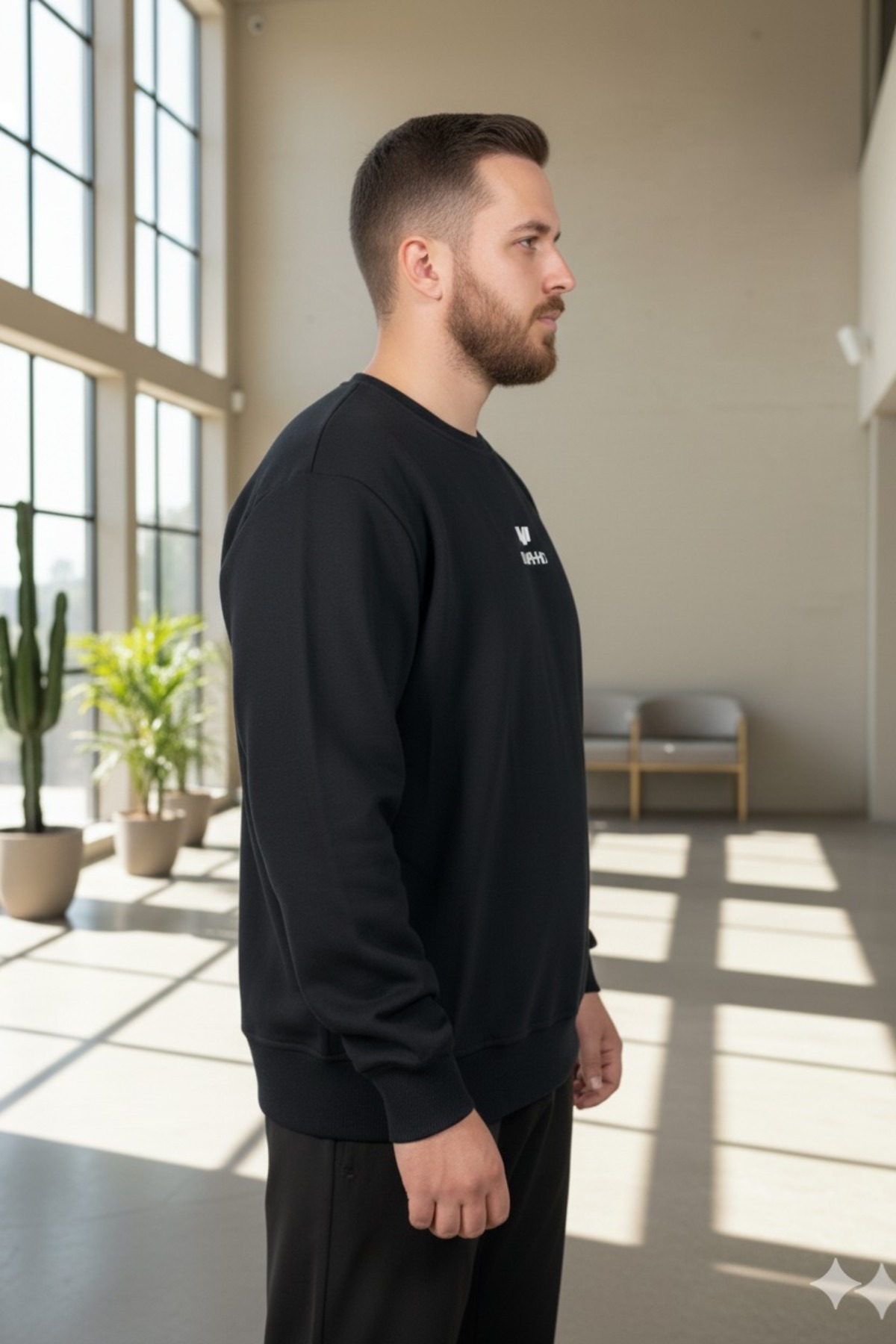 سویشرت مشکی یقه گرد، نخی، فیت استاندارد، برش معمولی، سه نخ.