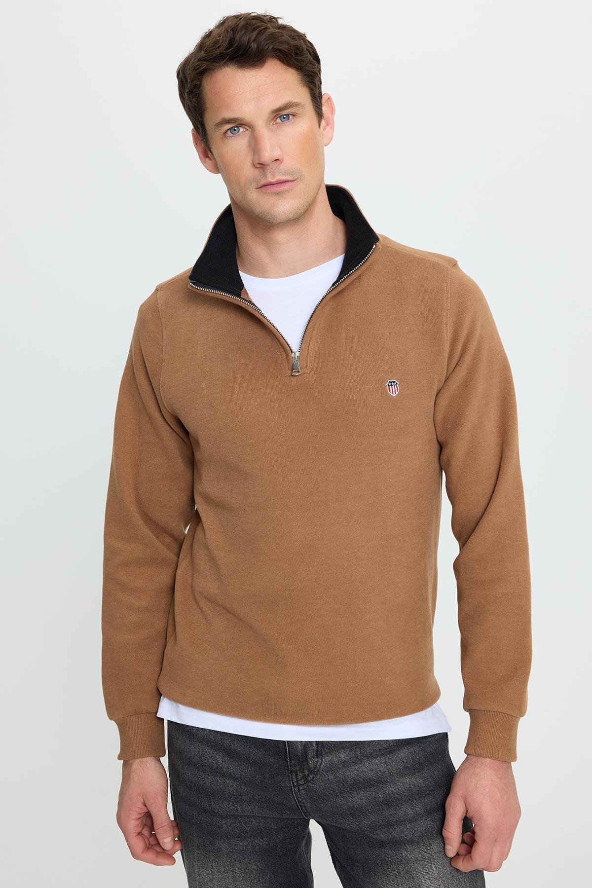 سویشرت مردانه اسلیم فیت، نخی، برش باریک، یقه ایستاده، به رنگ قرمز مایل به قهوهای