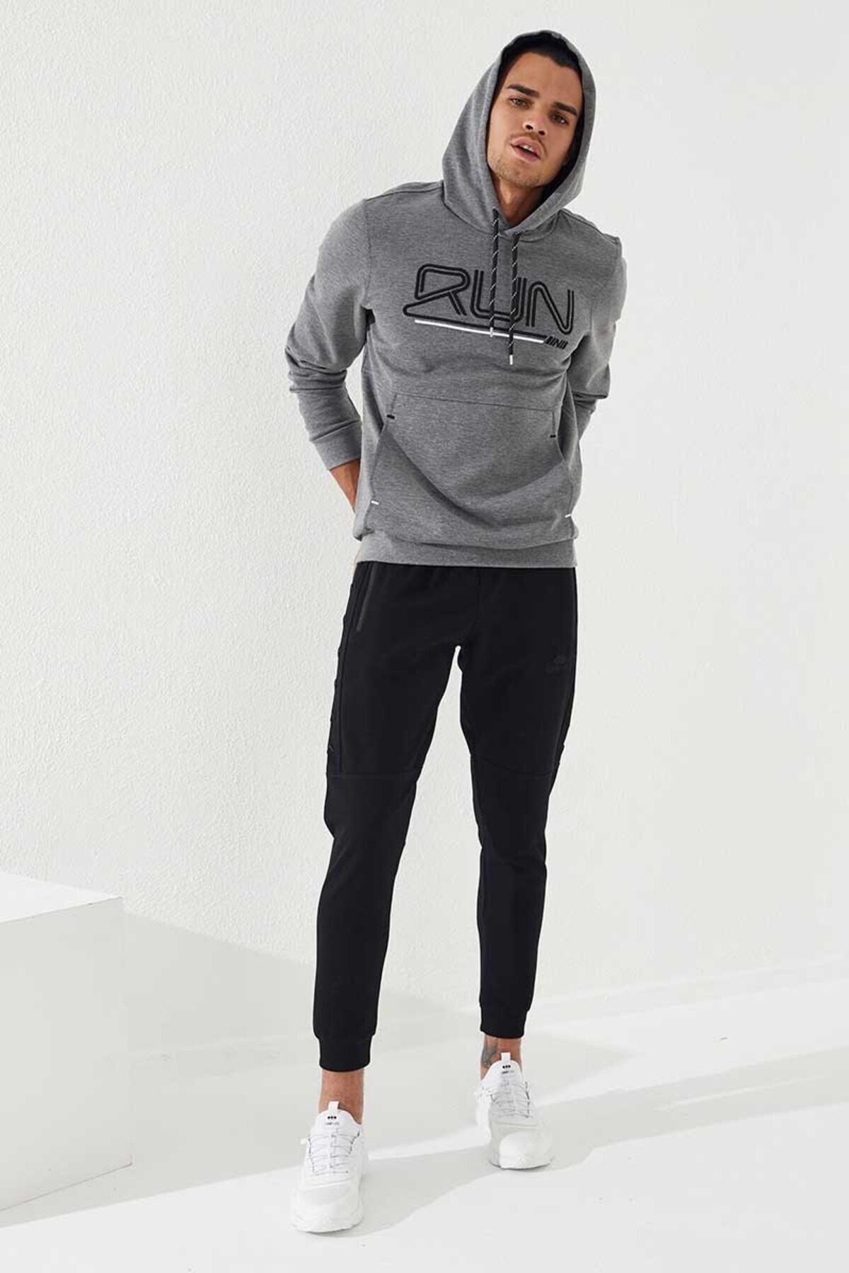 سویشرت مردانه کلاهدار خاکستری ملانژ با متن گلدوزی شده، سایز استاندارد – 87887